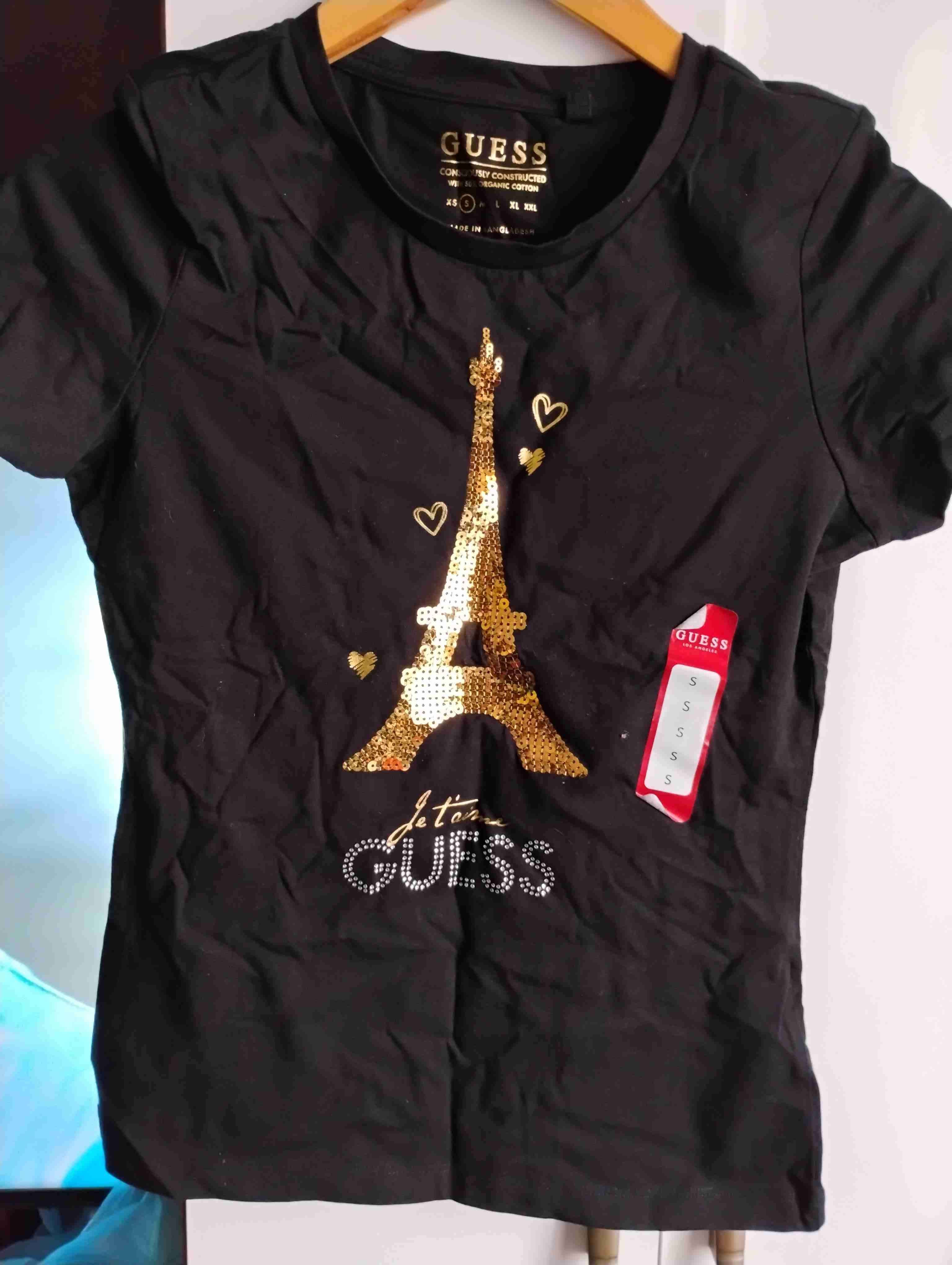 Polera negra marca Guess, con diseño de torre Eiffel en lentejuelas doradas. Ideal para un look casual y elegante.