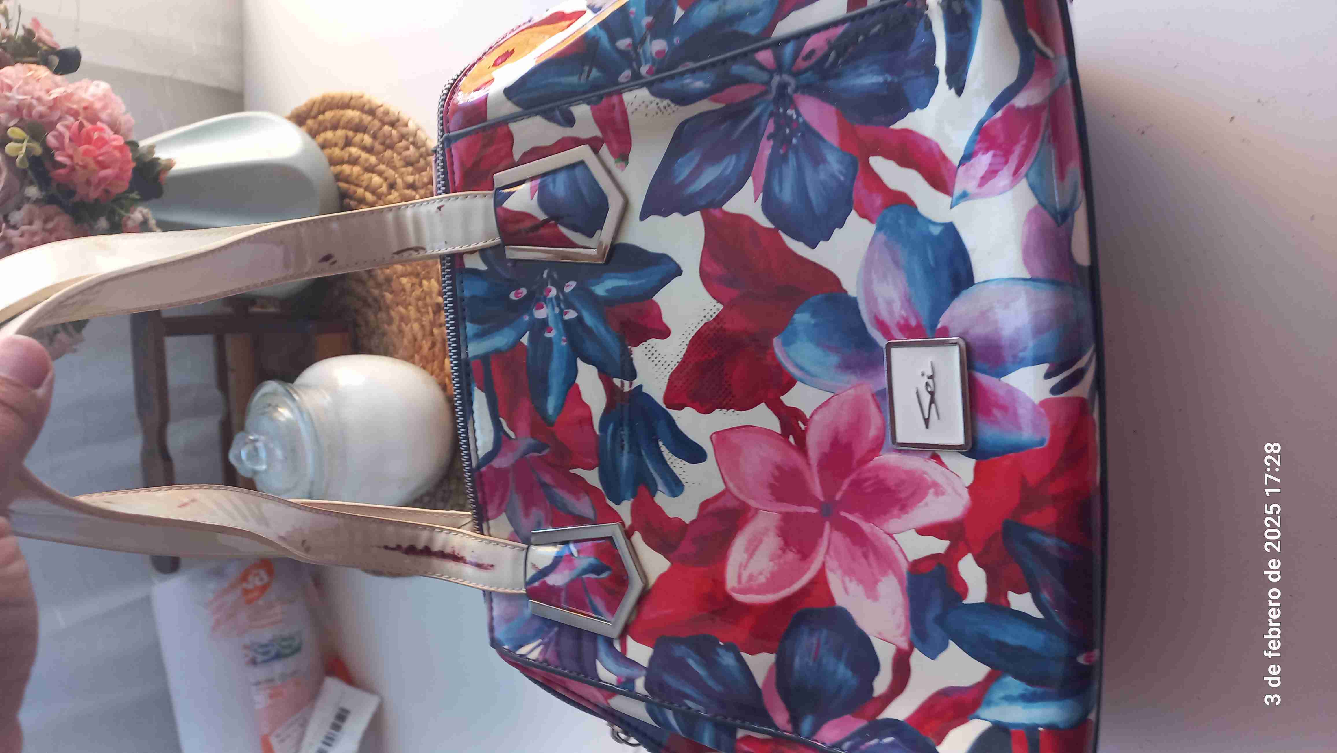 Cartera con diseño floral vibrante, ideal para el uso diario. Está en buen estado con señales ligeras de uso.