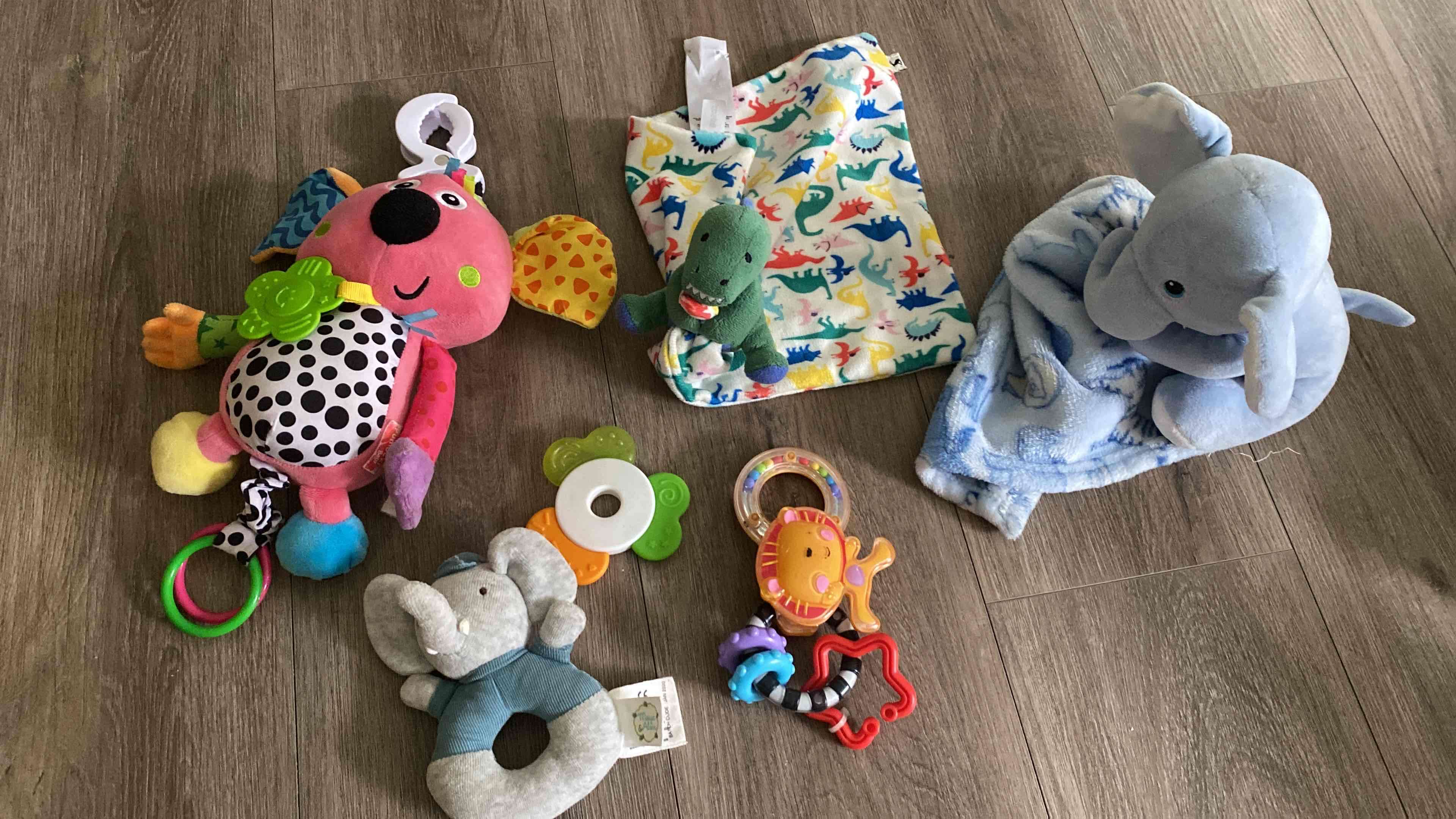 Conjunto de juguetes suaves y coloridos, ideales para bebés. Incluye peluches y mordedores en buen estado.