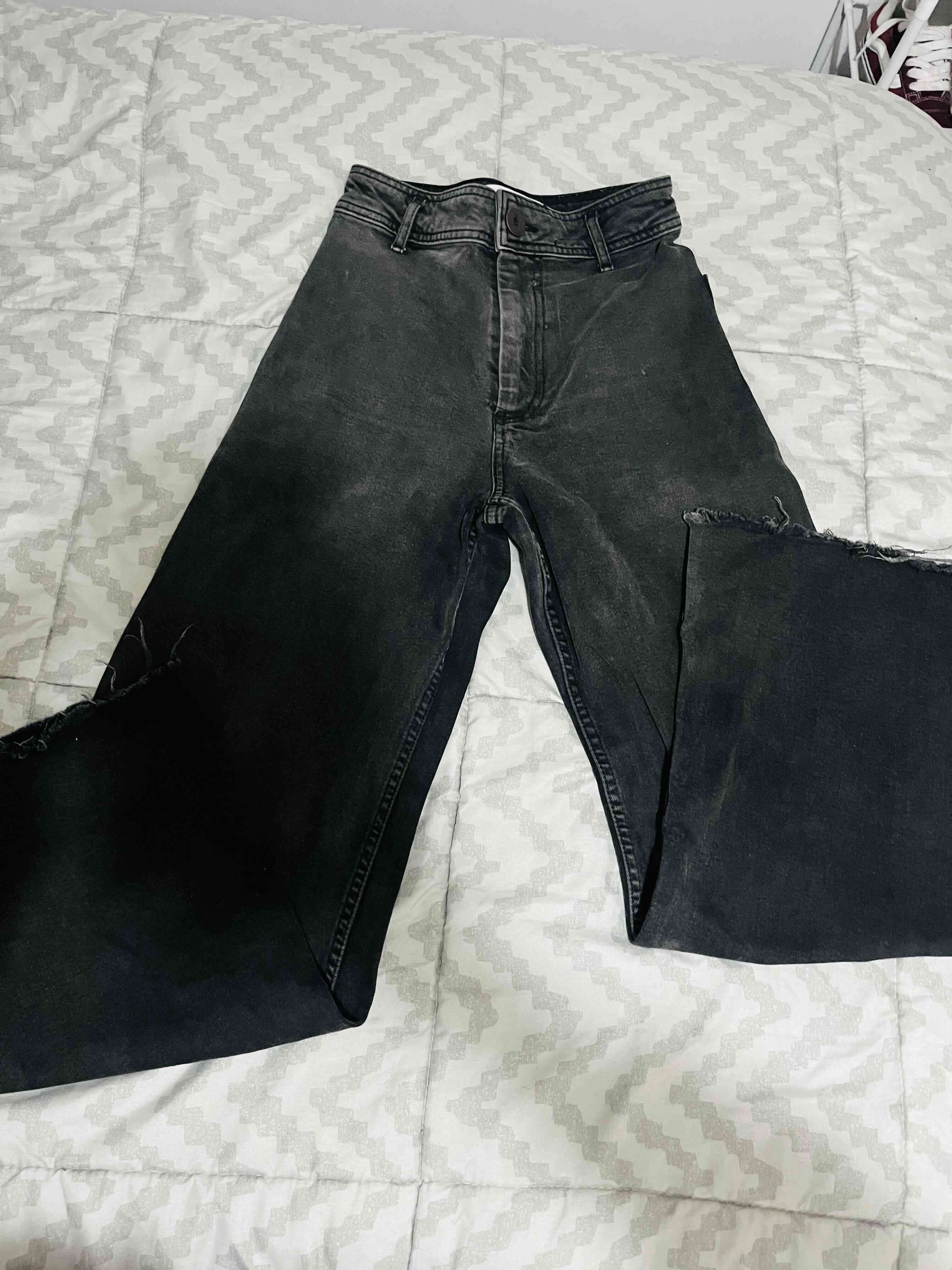 Jeans negros con efecto desgastado en rodillas, estilo casual. Buen estado general para uso diario.