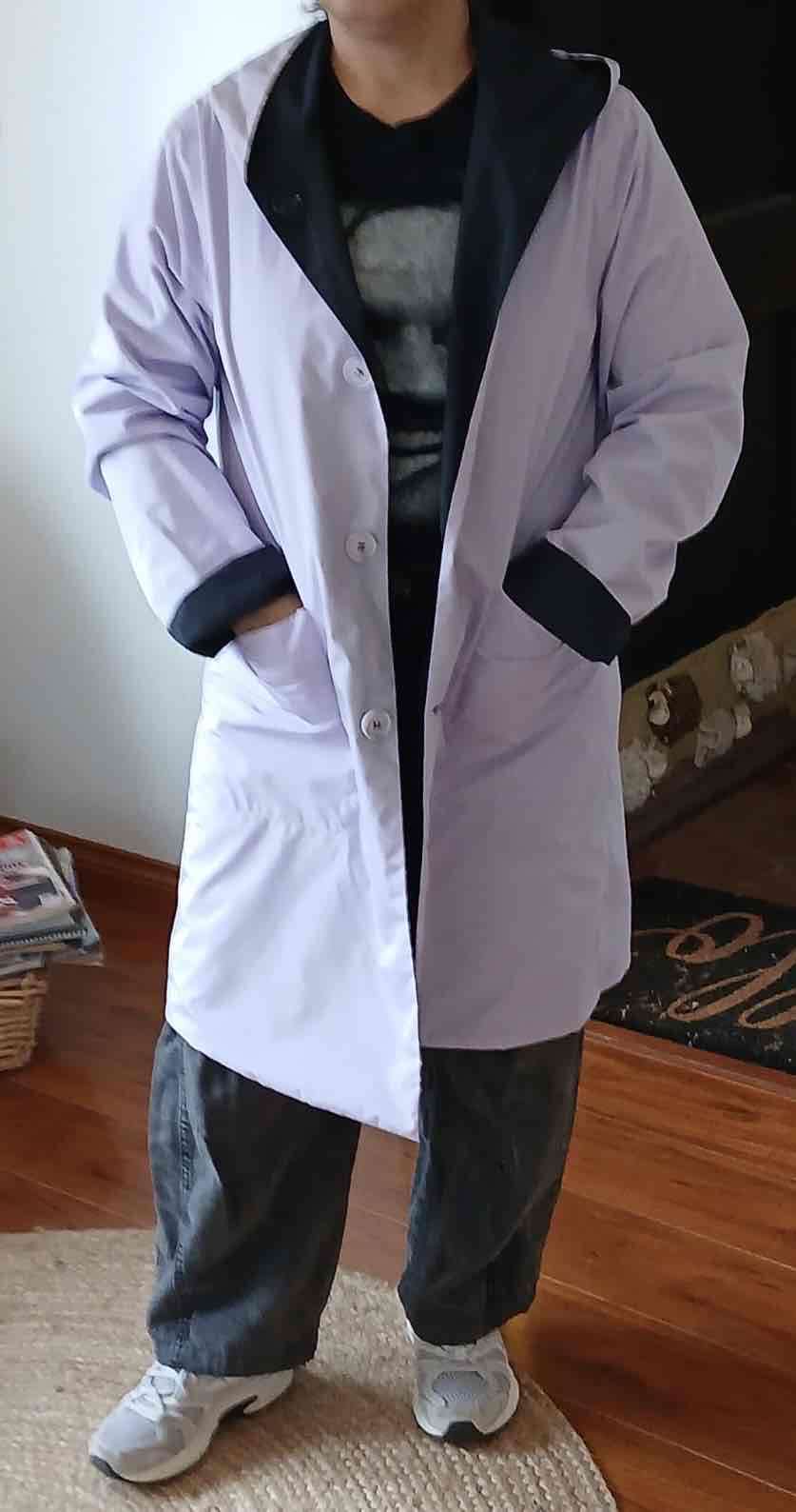 Impermeable reversible, azul/ lila, talla M. Tiene botones y una capucha. Buen estado general, casi nuevo.