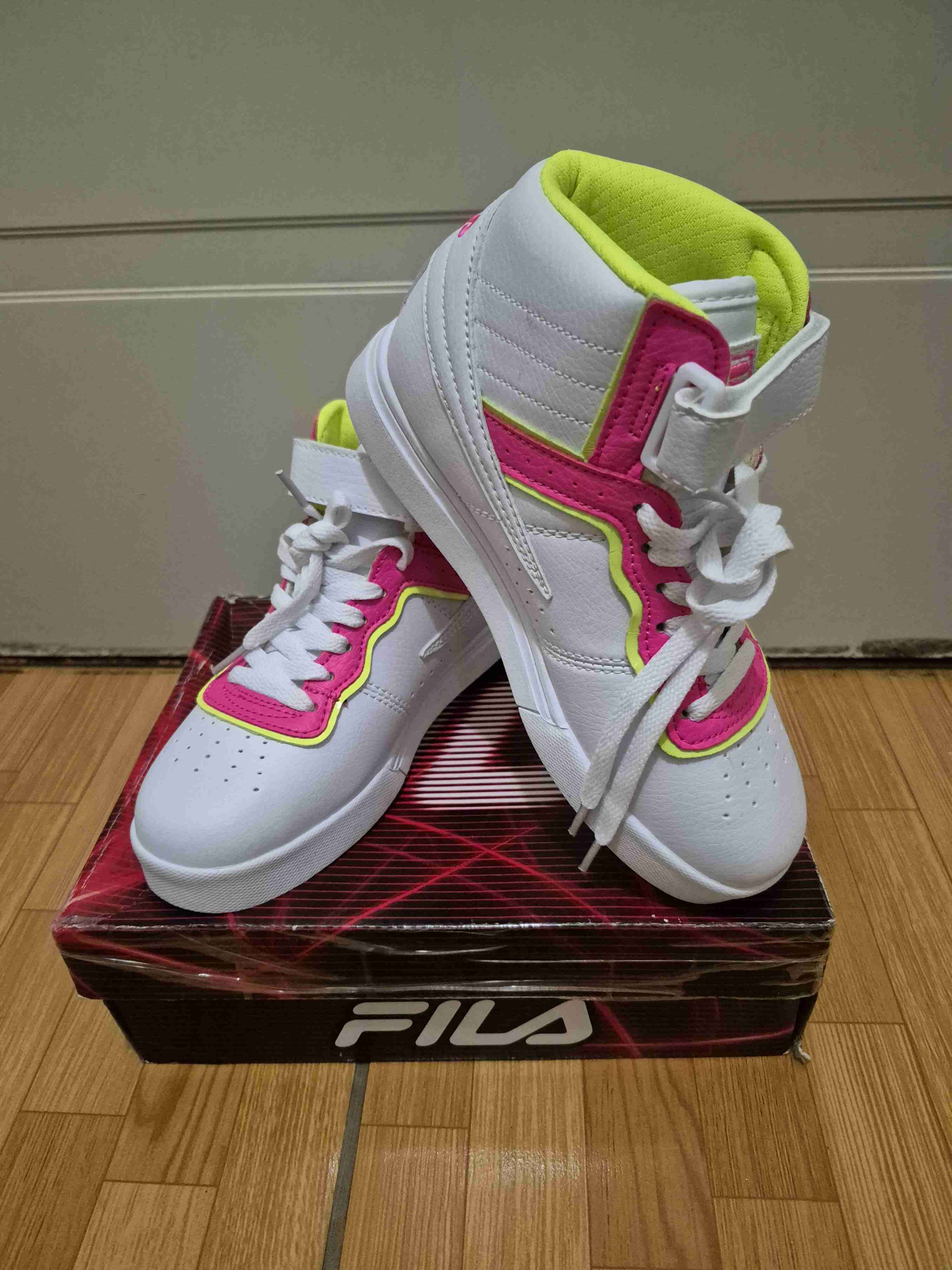 Zapatillas deportivas blancas con detalles fucsia y amarillos. Diseño alto, ideales para un look urbano. Nuevas sin uso!