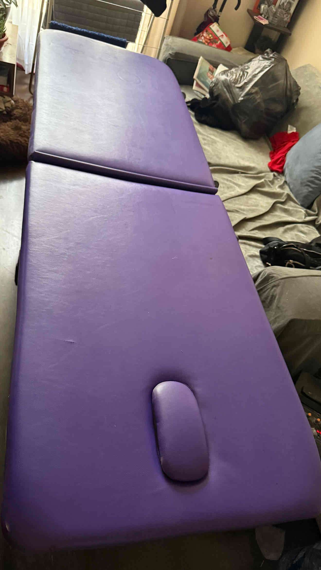 Camilla de masaje plegable en color morado, ideal para terapias. En buen estado con leves signos de uso.