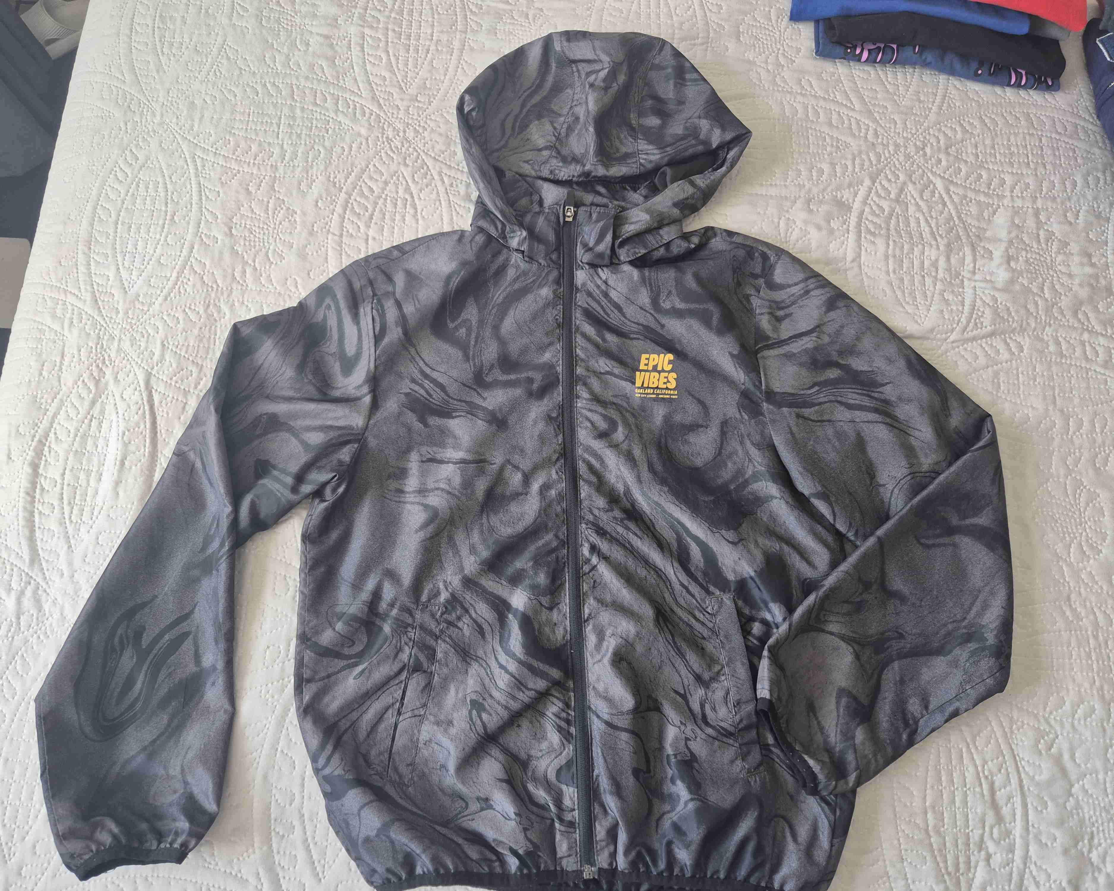 Chaqueta gris con capucha, diseño con estampado moderno. Perfecta para el uso diario o actividades al aire libre. Cortavientos Talla 16 Marca H&M