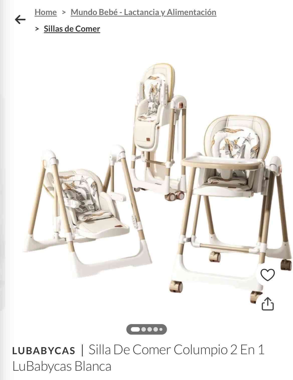 Práctica silla de comer que se convierte en columpio, ideal para bebés. Estructura ajustable y diseño moderno.