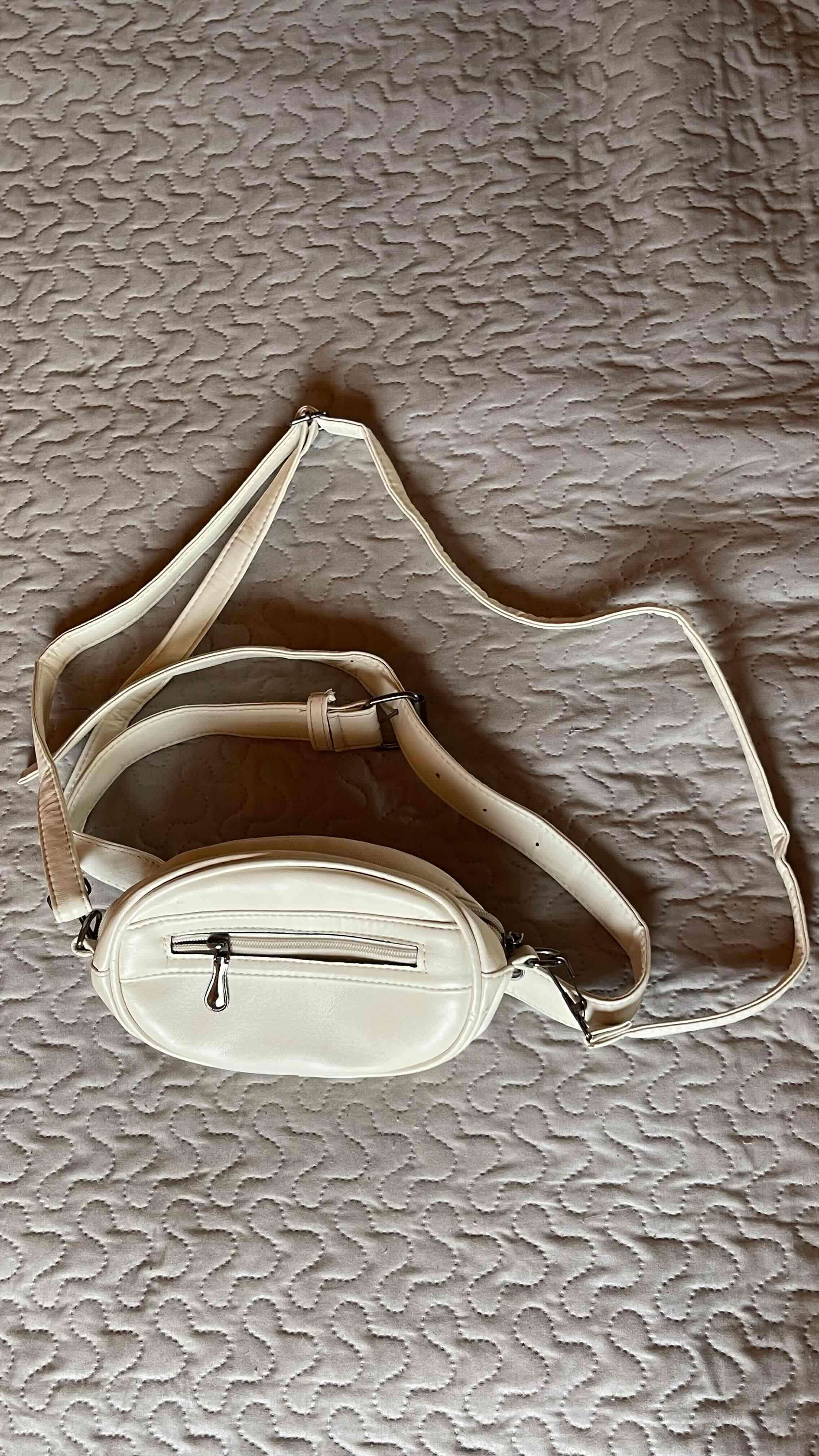 Banano blanco de cuero sintético en buen estado, ideal para uso diario. Presenta un diseño sencillo y práctico. Con correa para usar como cartera y como banano