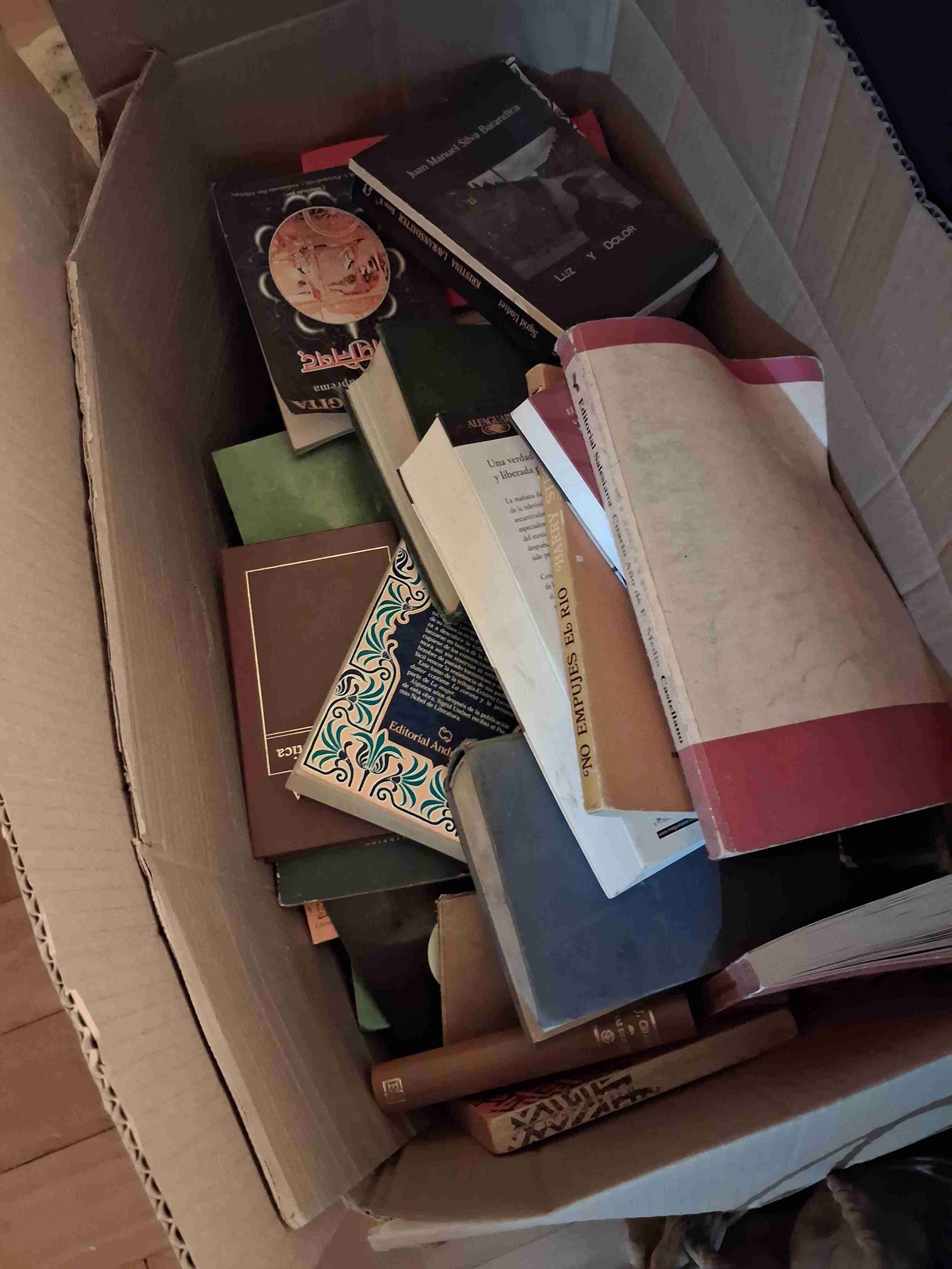 Gran caja con libros usados en buen estado. Ideal para lectores ávidos o coleccionistas.