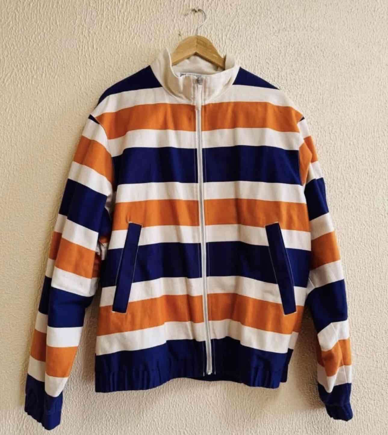 Chaqueta con diseño de rayas horizontales en azul, blanco y naranjo. Ideal para un look casual. En buen estado general.