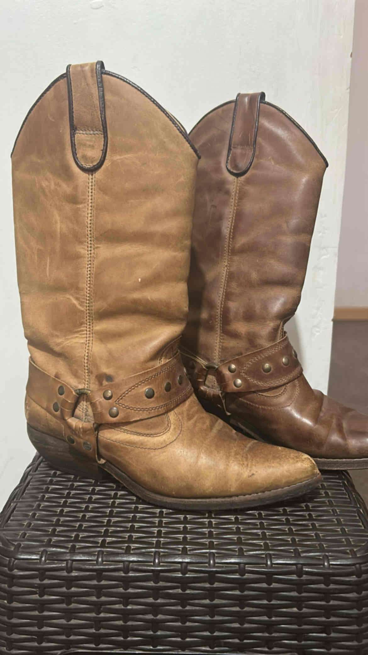 Botas de cuero estilo vaquero en tono marrón, con detalles metálicos. En buen estado general, ideales para un look casual o de campo., número calzado 35.
