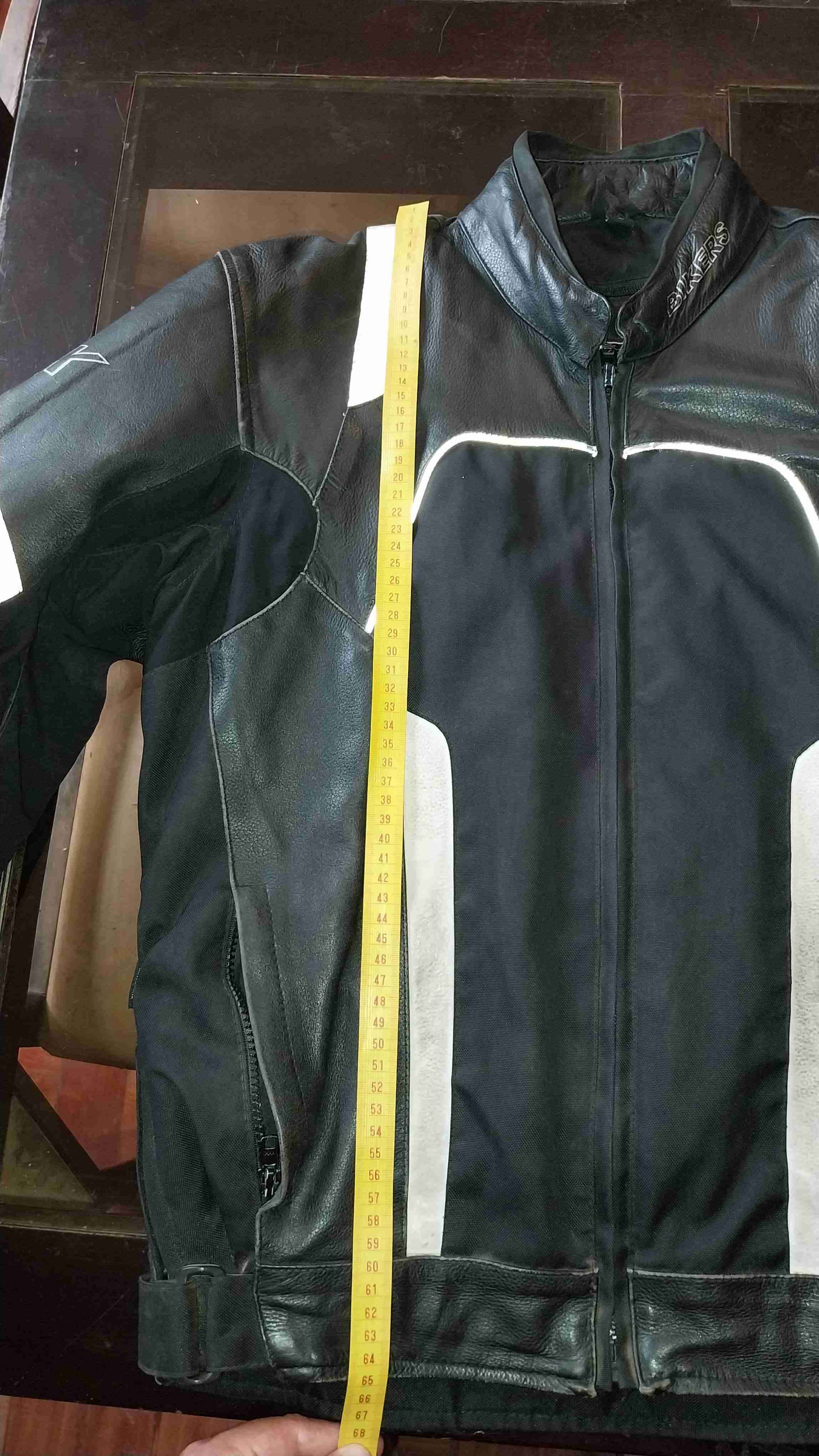 Chaqueta de moto en buen estado, ideal para protección y estilo sobre la motocicleta. Presenta ligeros signos de uso.