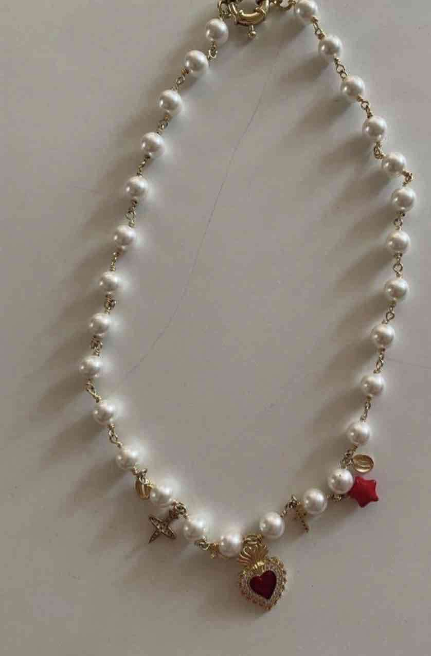 Elegante collar de perlas con dijes dorados y un corazón rojo. En buen estado, ideal para eventos formales.