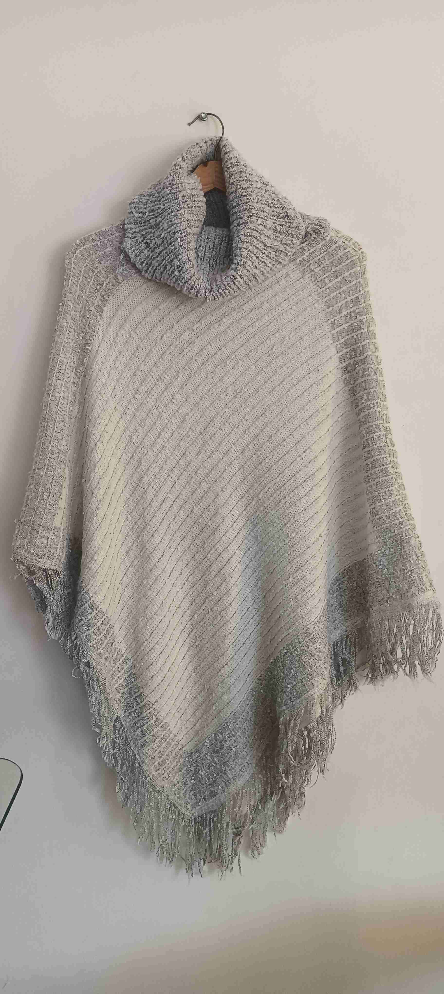 Poncho de lana en tono gris con flecos, ideal para el frío. Tejido cálido y cómodo para usar en invierno. Moda circular