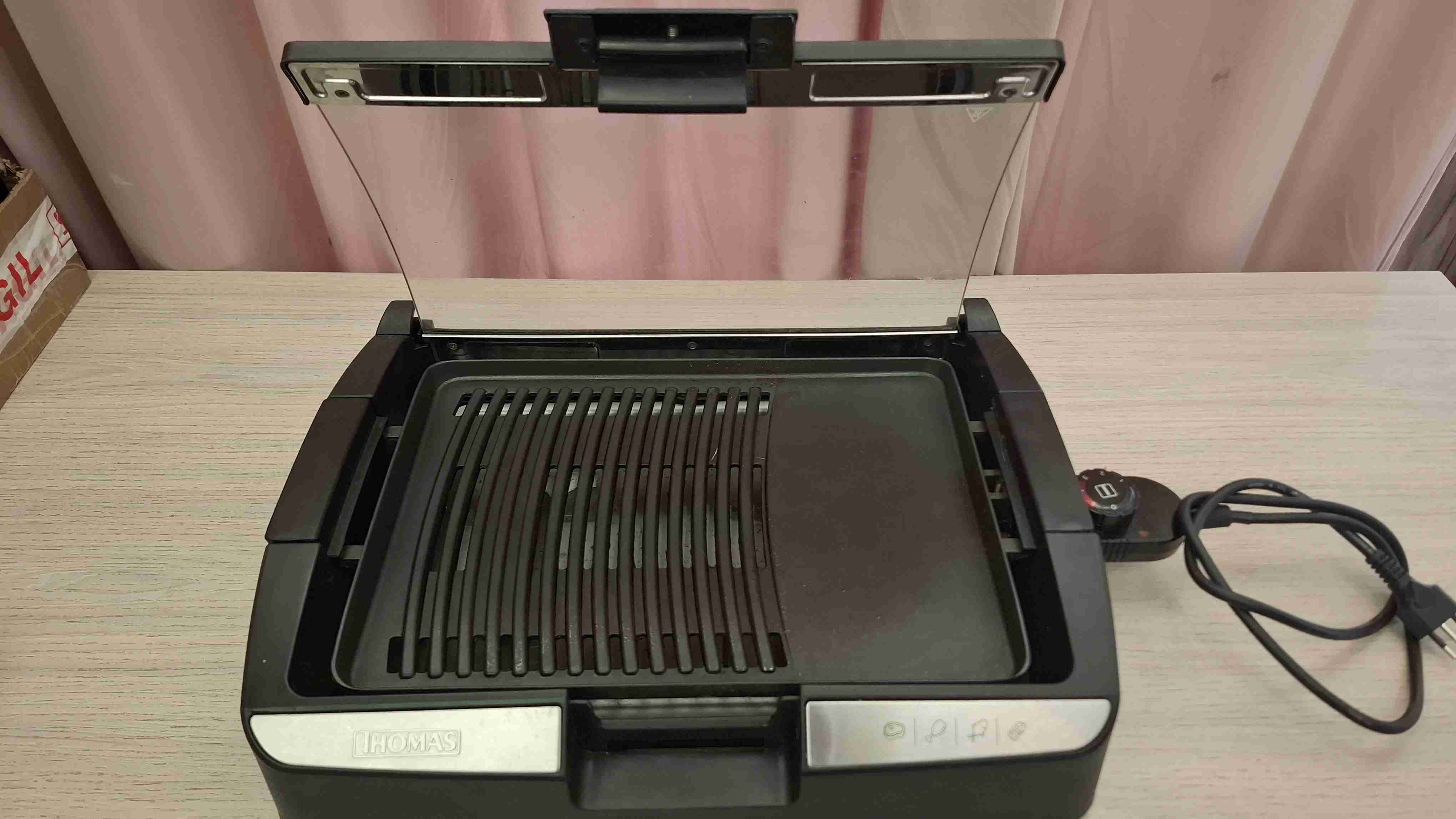 Práctica parrilla eléctrica de la marca Thomas, ideal para interiores. Buen estado, poco uso.