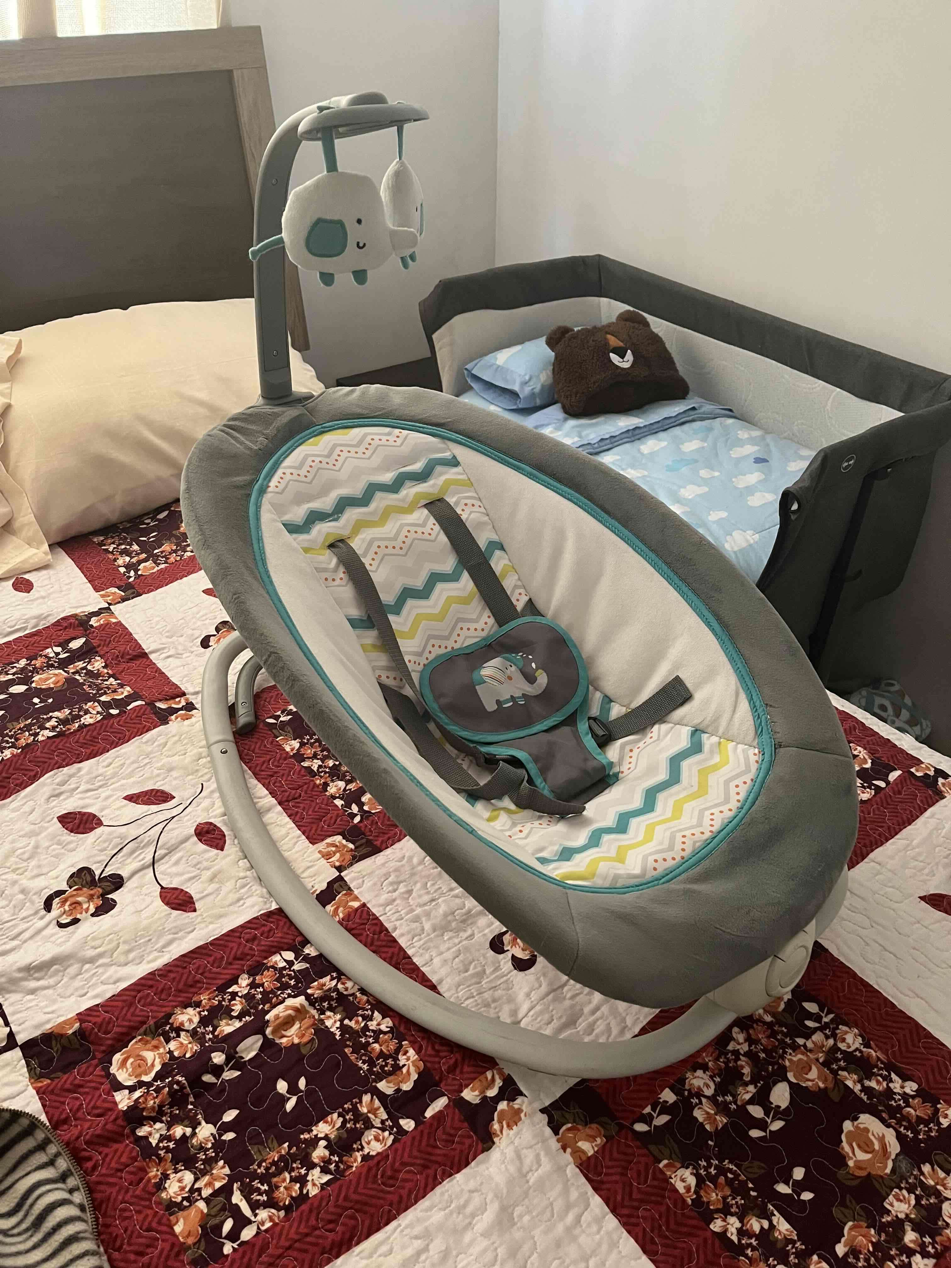 Cómoda silla mecedora en color gris con cinturón de seguridad. Tiene vibración y música con volumen ajustable (usa pilas AA)