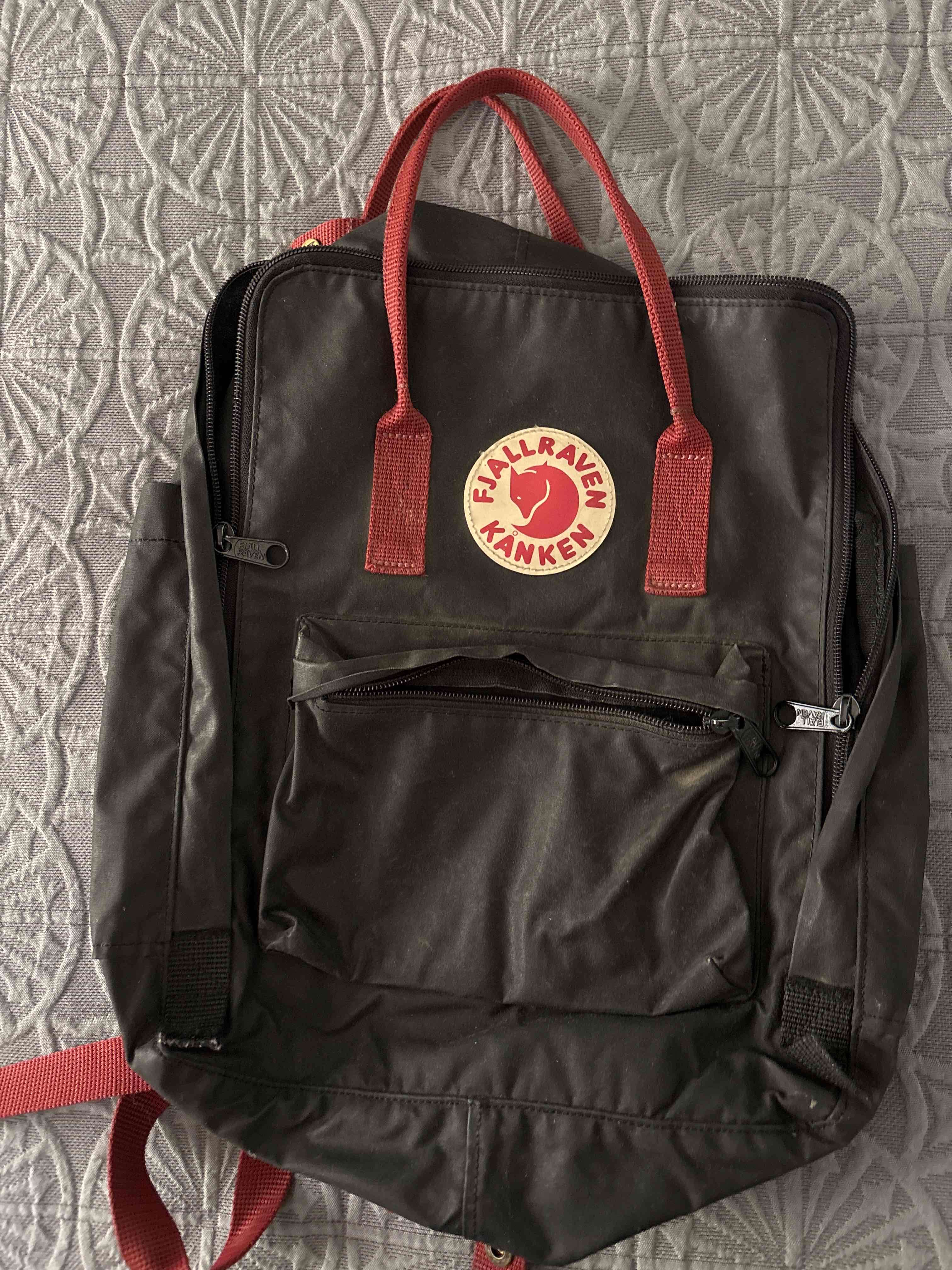 Mochila estilo clásico, color negro con asas rojas, ideal para uso diario. En buen estado con algunas señales de uso.