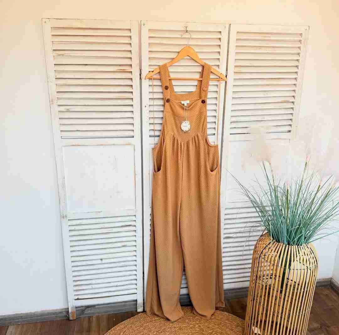 Jardinera casual en tono camel, ideal para un look relajado. Se ve en buen estado.