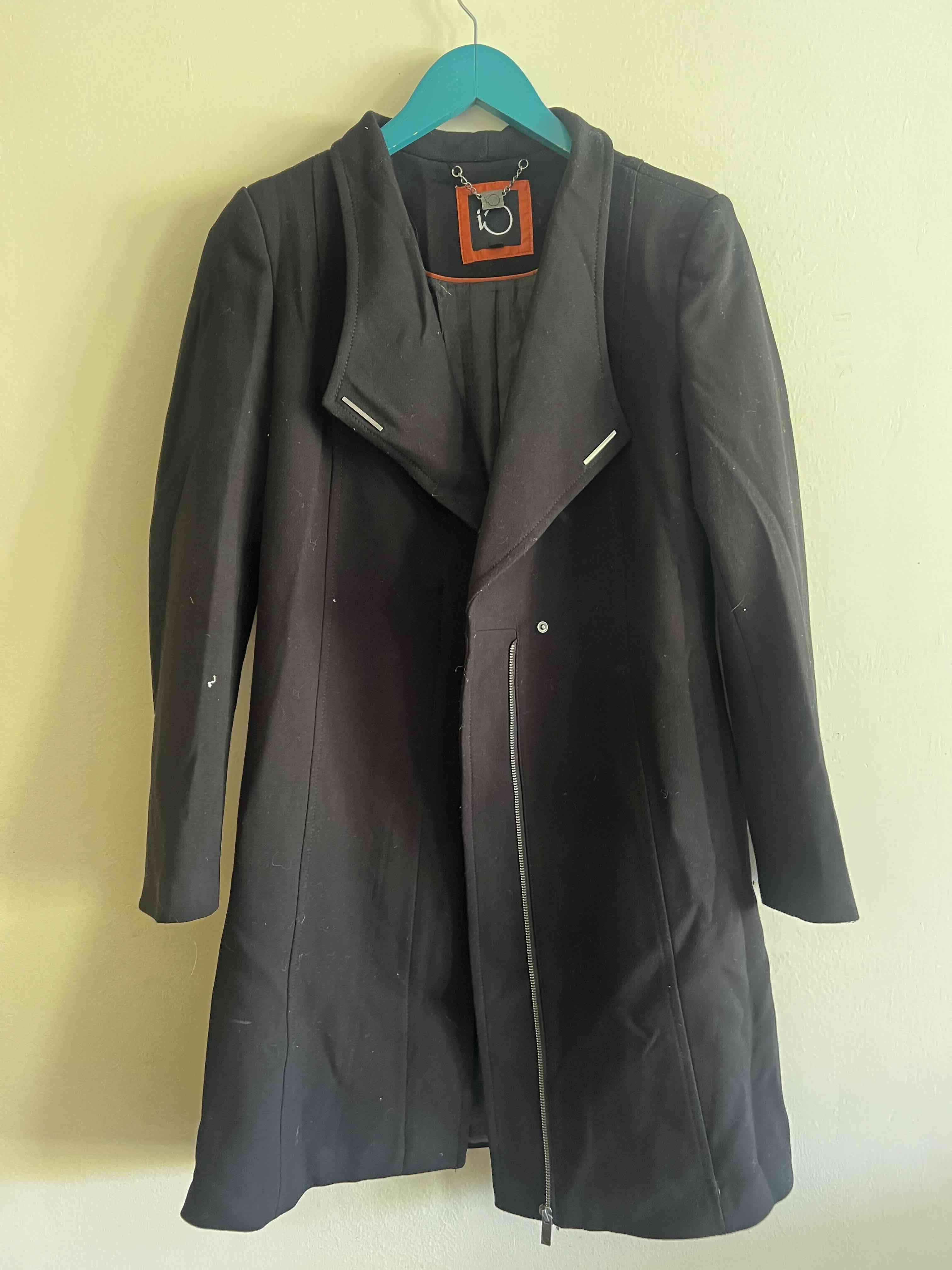 Abrigo negro de estilo elegante con cierre frontal. Adecuado para ocasiones formales. En buen estado general.