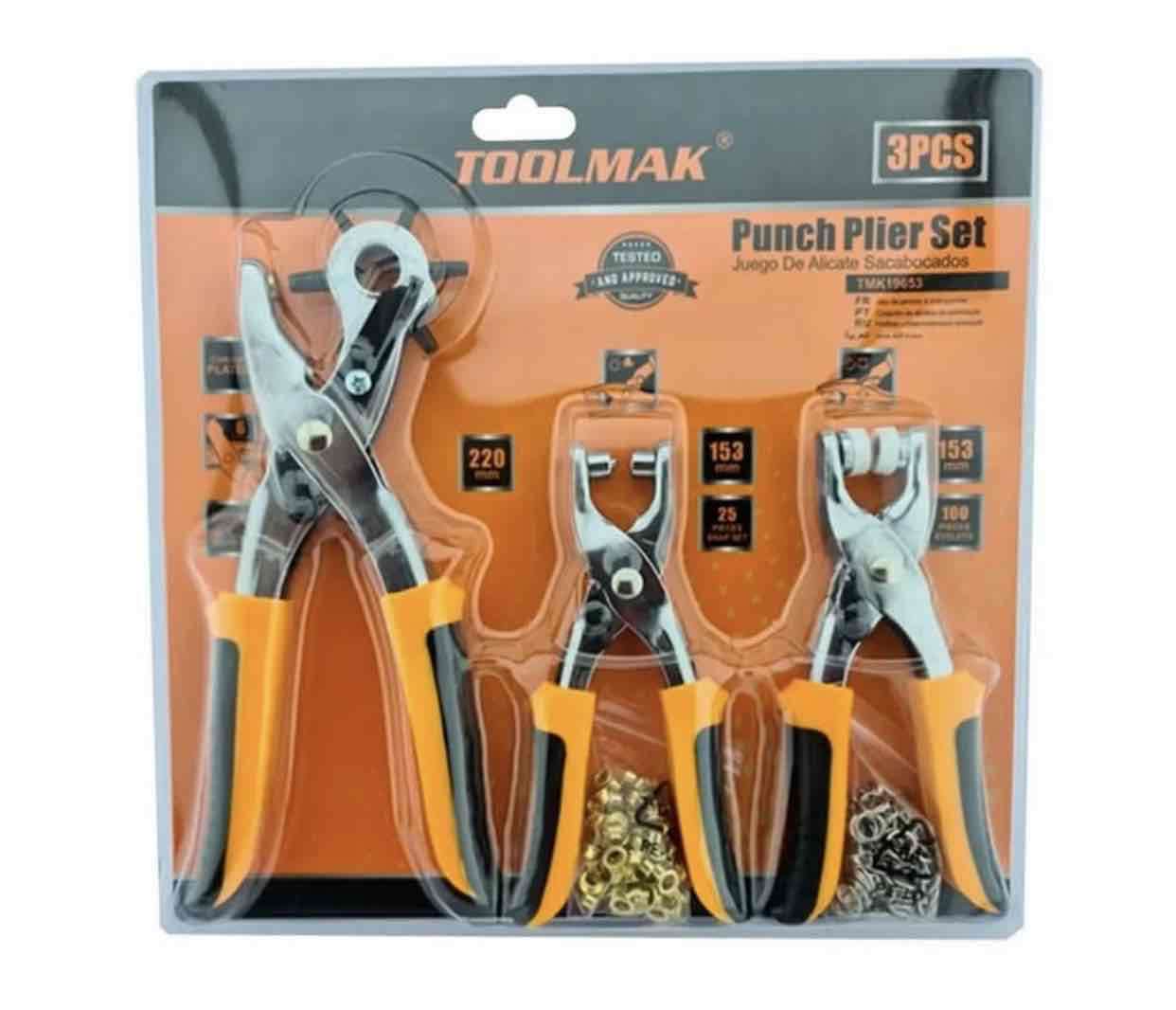 Juego de alicates ideal para trabajos manuales y reparación. Incluye diferentes tamaños de sacabocados para varios usos. Características: -Mango de goma antideslizante. - Sacabocado perforador para cuero, tela, papel y cartón. - Ideal para manualidades. - Medidas: 2, 2.5, 3, 3.5, 4, 4.5mm. Contenido: - Sacabocado perforador. - Prensa Ojetilladora. - Prensa para Broches. - 100 ojetillos de 4 mm. - 100 Broches de presión de 9,5 mm.