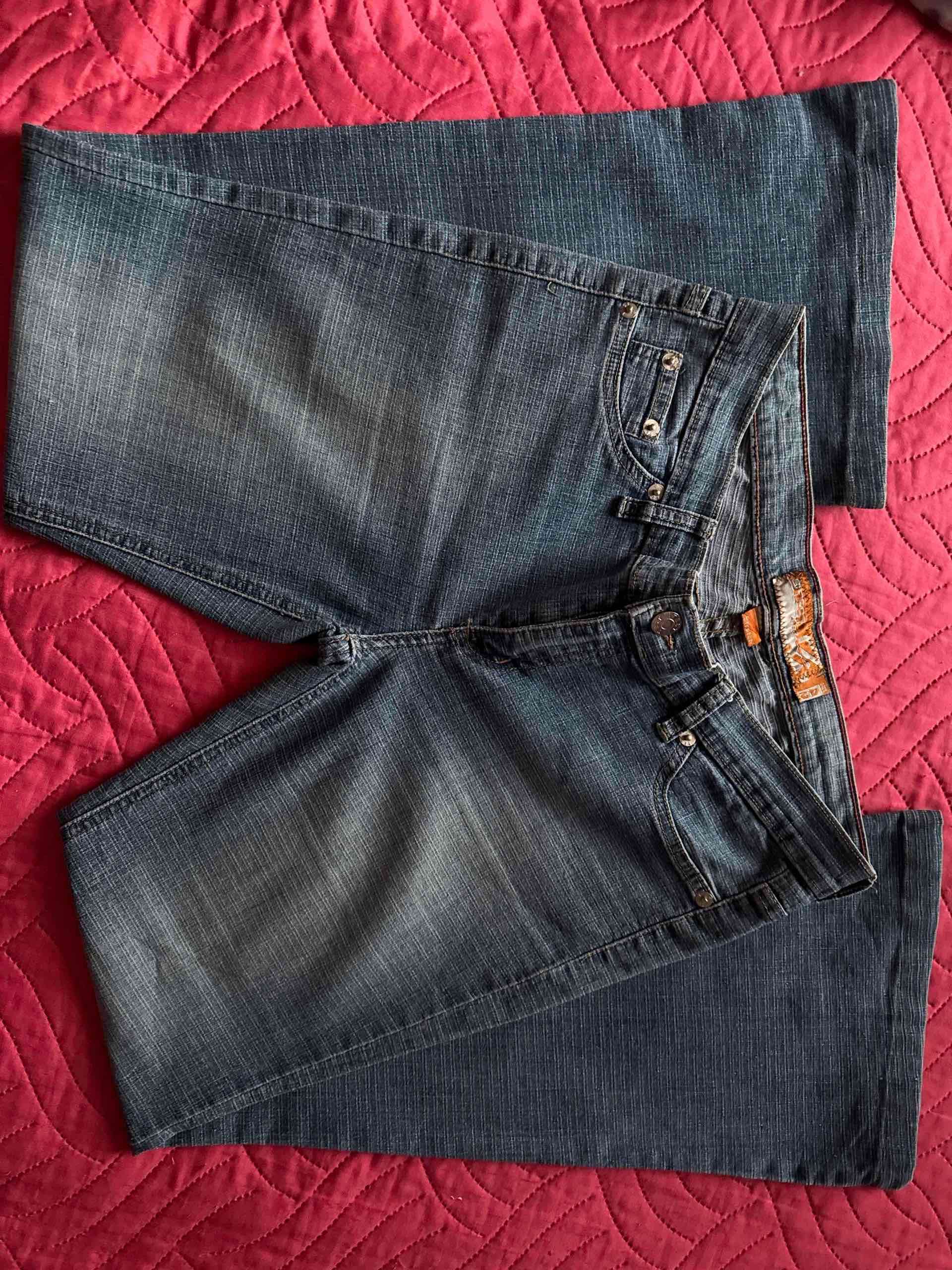 Jeans de mezclilla en buen estado, ideal para uso diario. Color azul claro con desteñido en las piernas por delante y por detrás, tipo flare (pata de elefante)y elasticado. Son talla 42 chica, es más bien una talla 38-40. Botón y cierre funcionales. Solo tiene un piquete en la parte de atrás de la pierna izquierda (última foto).