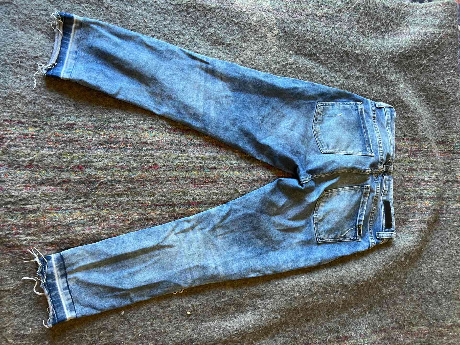 Jeans clásicos en azul, con estilo desgastado y bordes deshilachados. Ideales para un look casual. En buen estado general.
