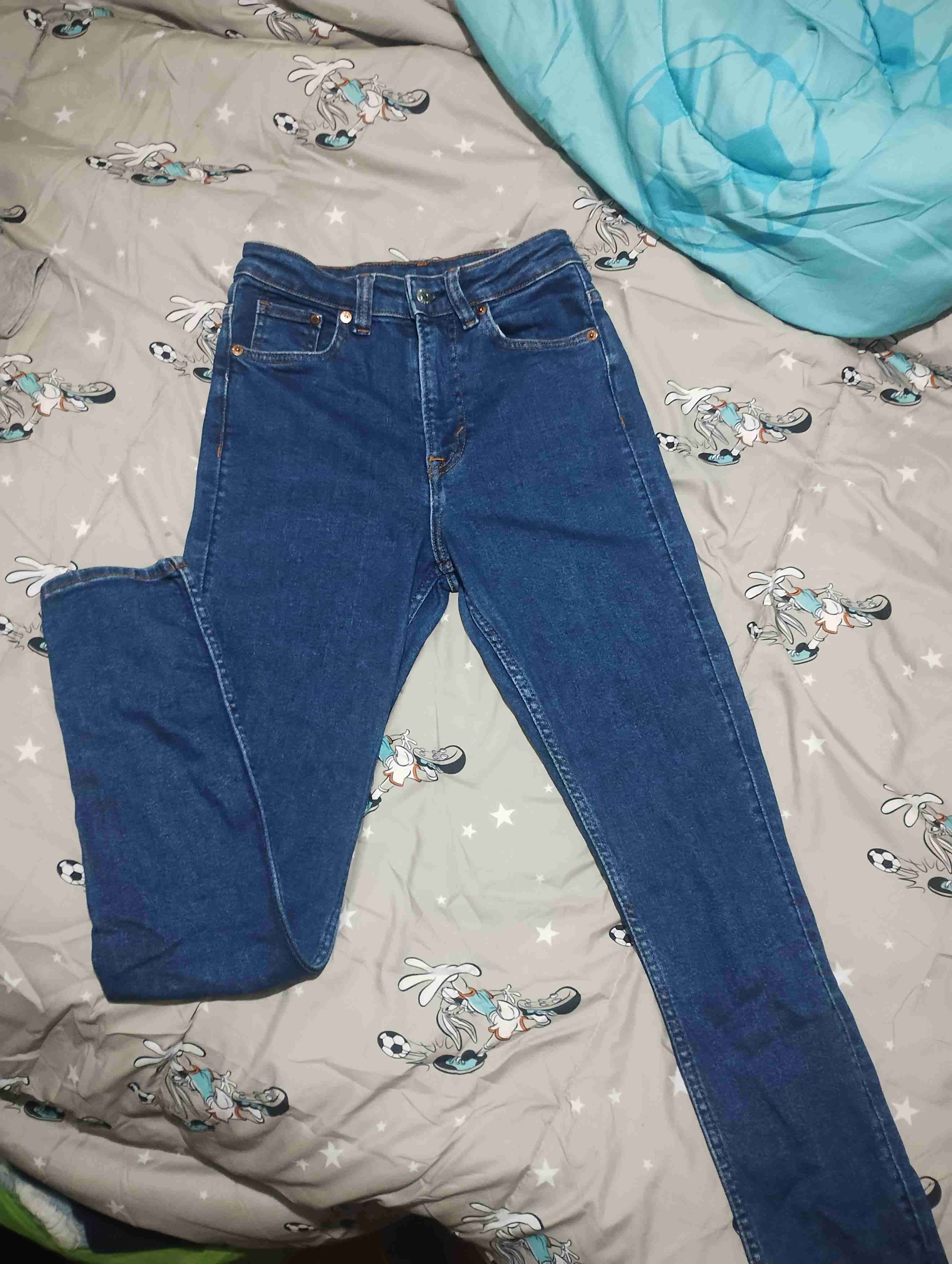 Jeans azul oscuro en buen estado, ideal para el uso diario. Cómodos y versátiles. Detalle de desgaste en un bolsillo trasero