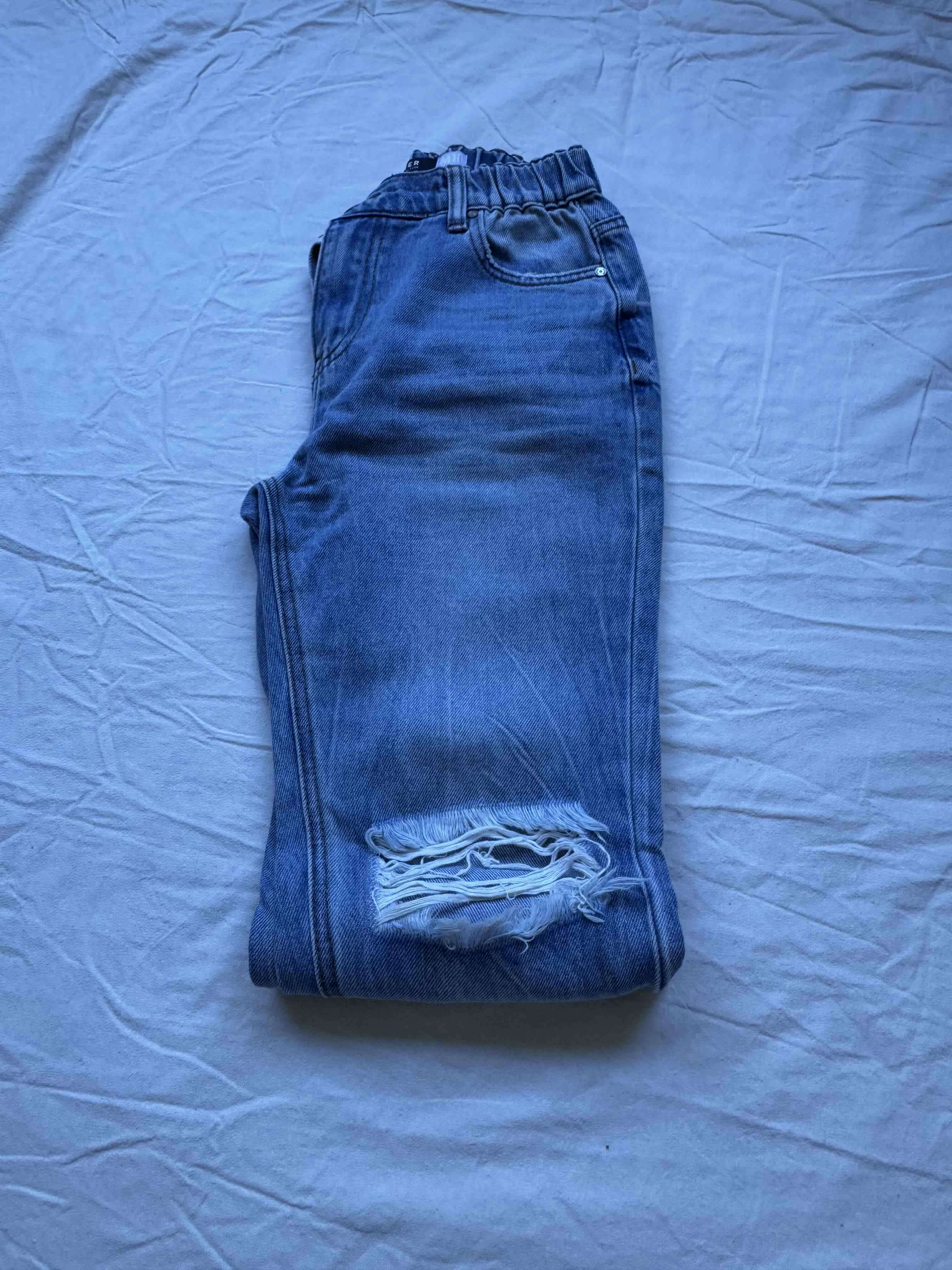 Jeans azul con detalle rasgado en la rodilla, estilo casual. En buen estado general.