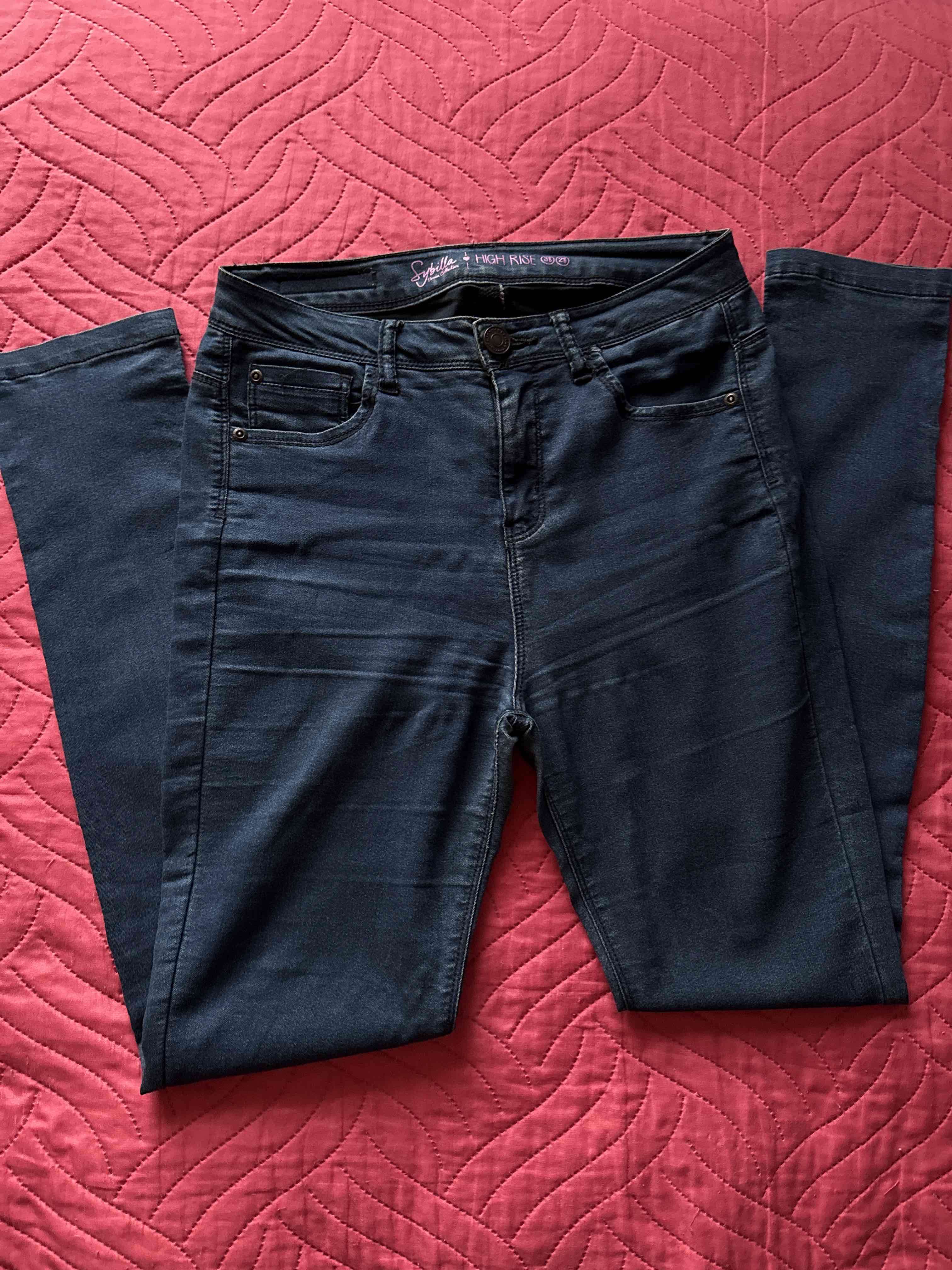 Jeans azul oscuro de tiro alto, ideal para un look casual. En buen estado, con pequeños signos de uso, tiene un poco de decoloración en la zona de entrepierna (foto 4). Botón y cierre totalmente funcionales. Delgados y ajustados tipo pitillo.
