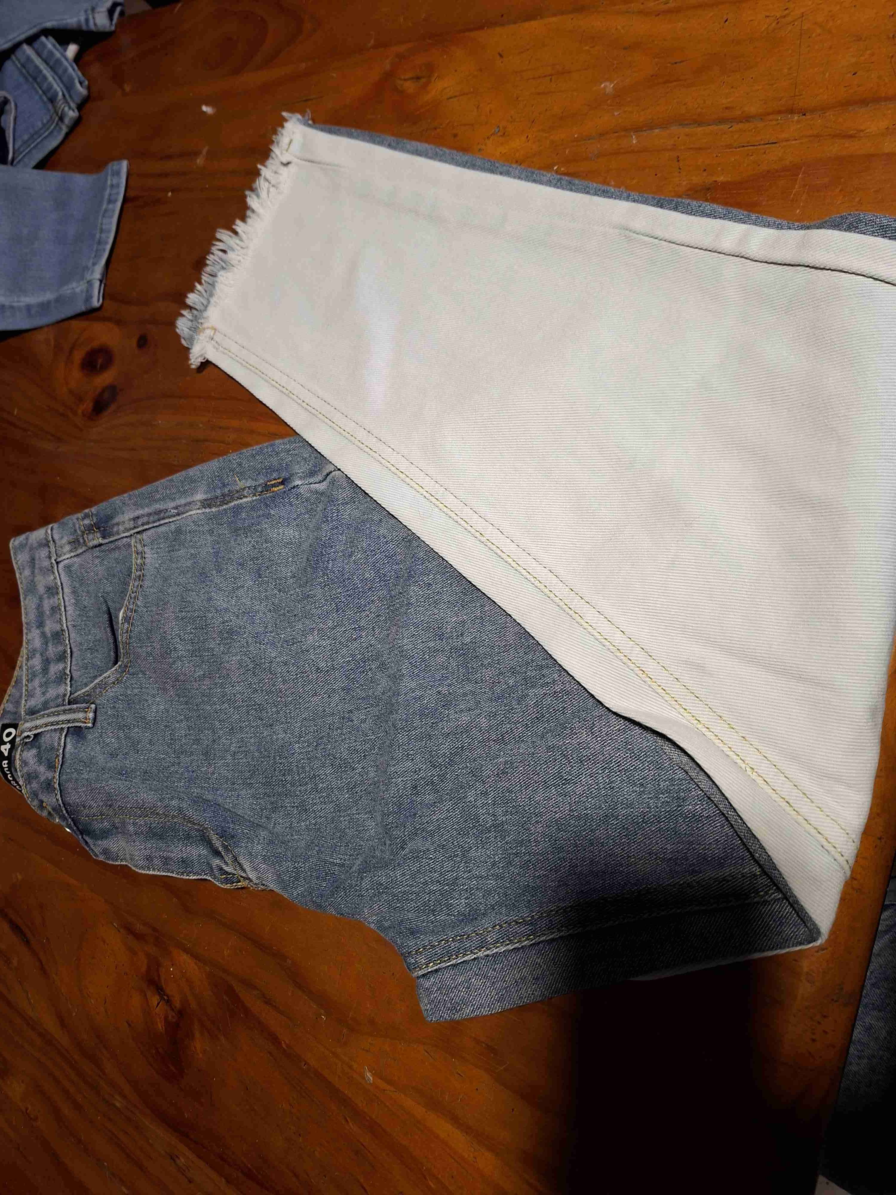 Jeans casuales en color azul y blanco marca denim con diseño deshilachado en la basta. Perfectos para un look relajado. Talla 40