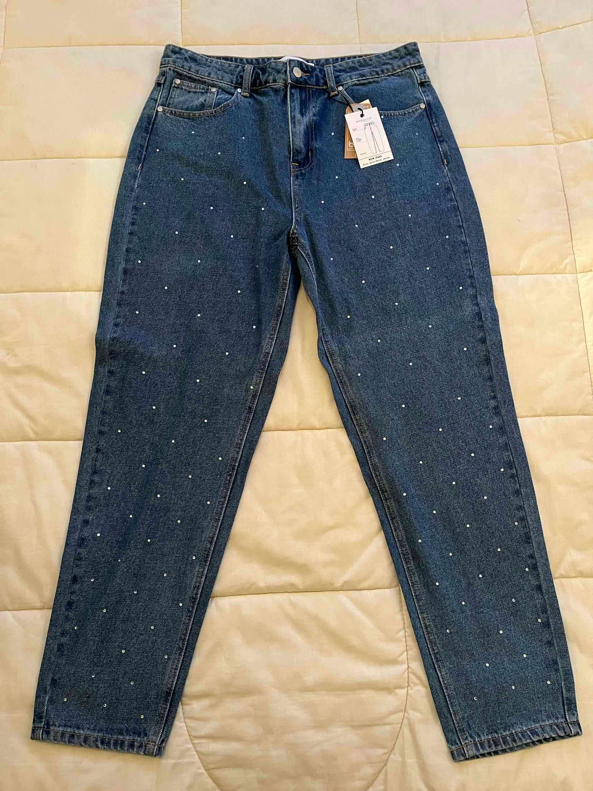 Jeans azules decorados con pequeñas tachas brillantes , estilo casual y moderno. Nuevos. Mom jeans Talla 42 No es elasticado