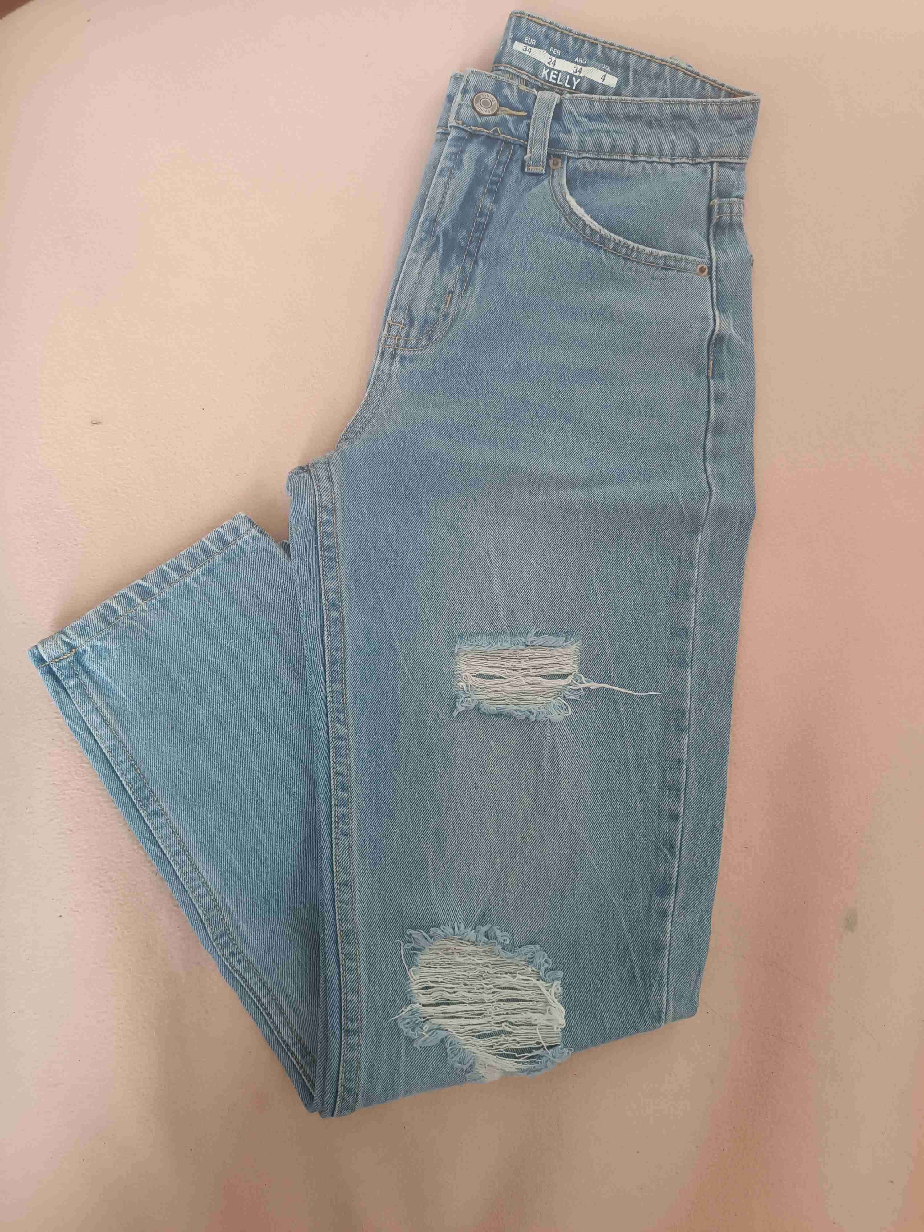 Jeans de mezclilla azul con diseño rasgado, perfectos para un look casual. En buen estado general.