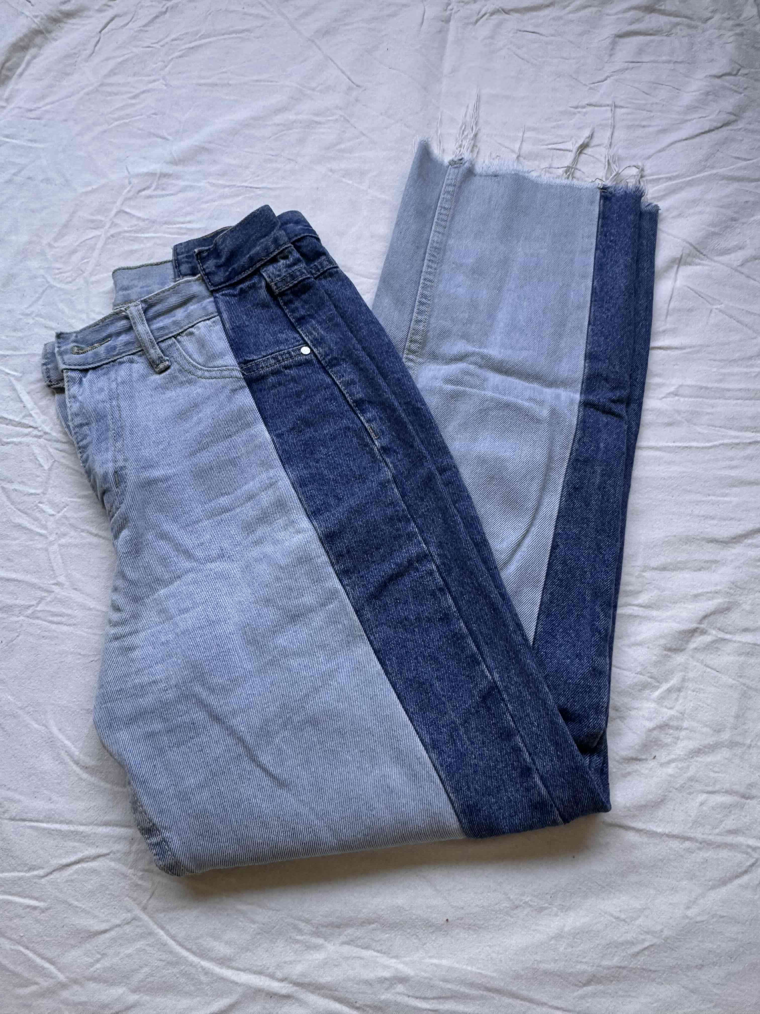 Jeans estilo moderno con diseño bicolor y detalles de desgaste. Ideal para un look casual.