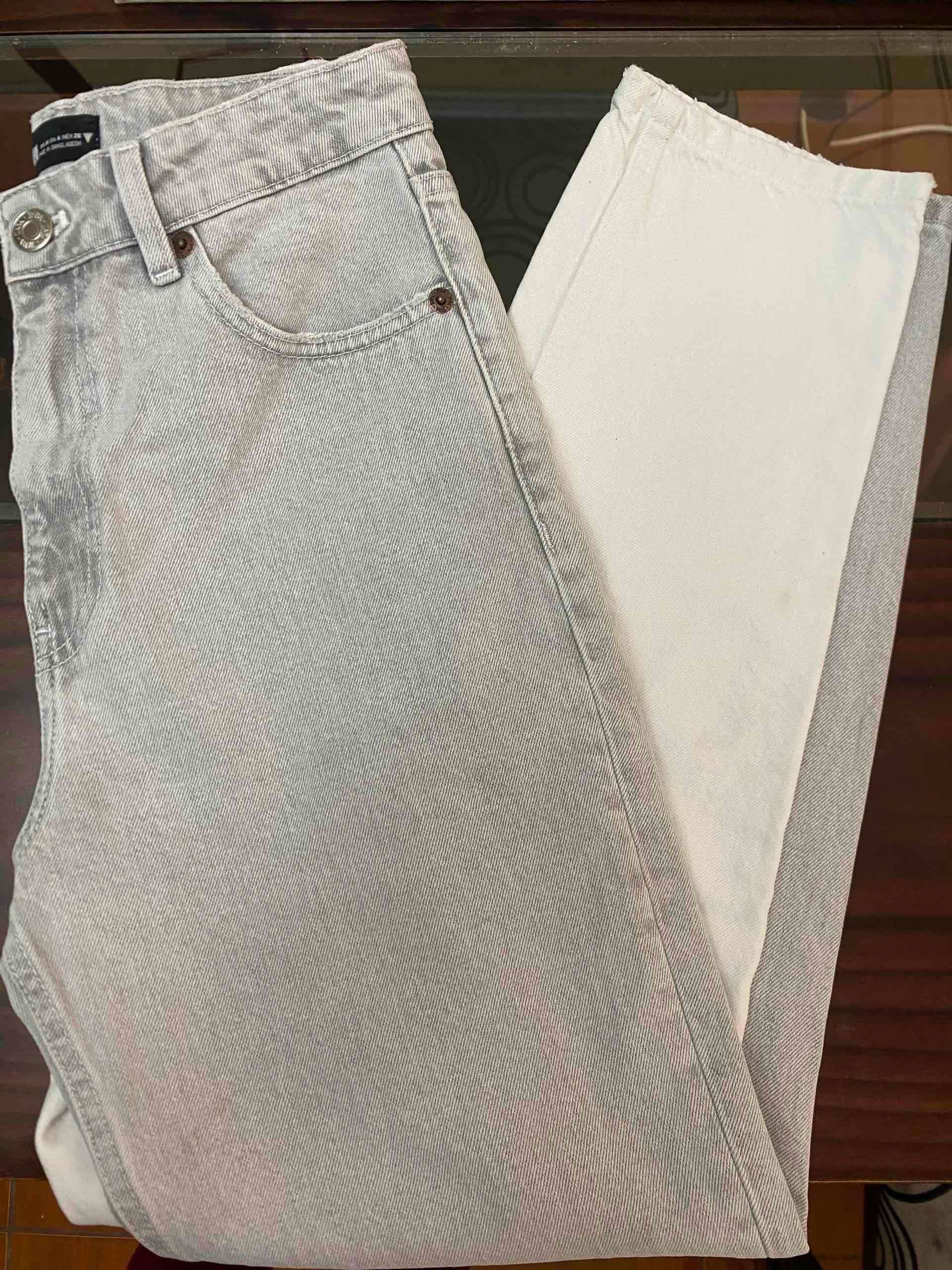 Jeans de tono gris claro, y blanco. Estilo JeansMom casual y cómodo. En buen estado, ideal para usar a diario. Talla 36