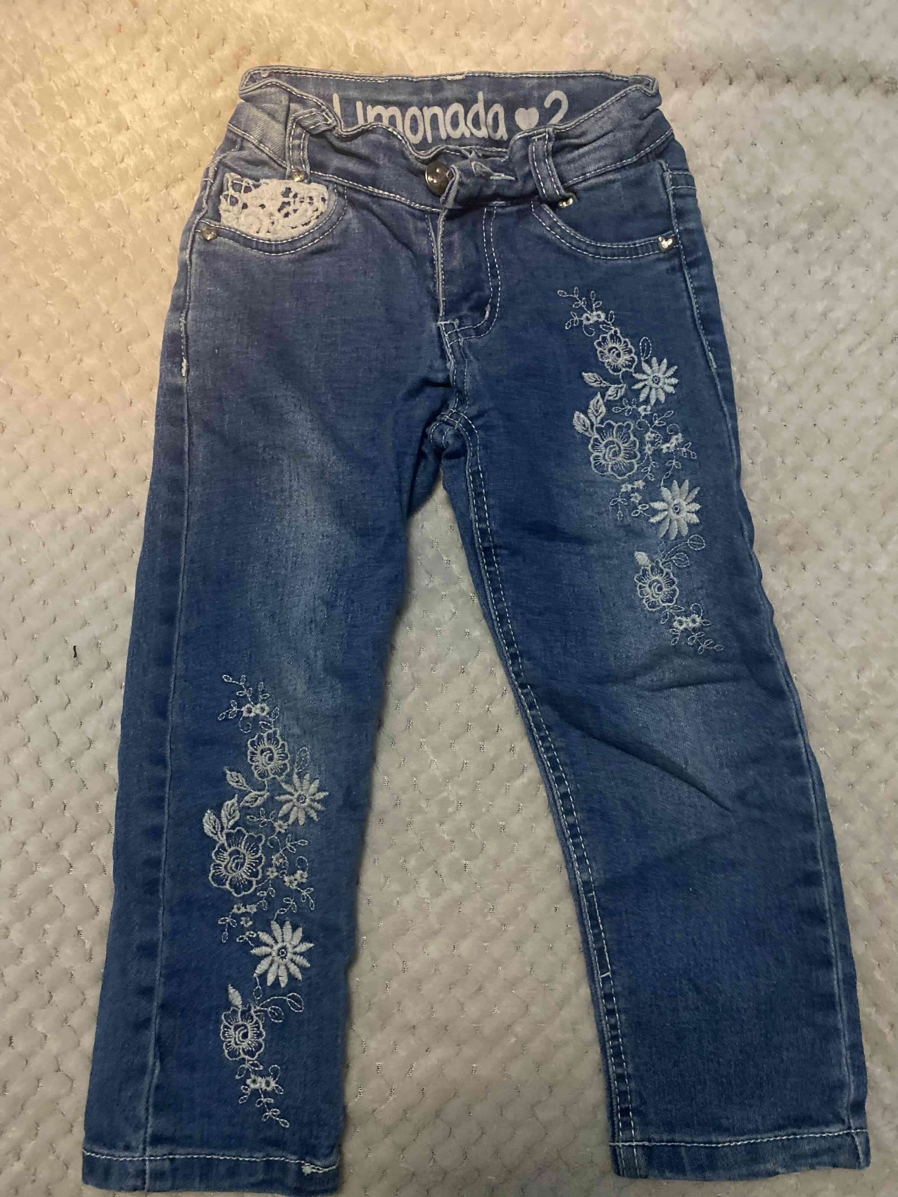 Jeans azules con decoraciones florales y encaje y pantalón de cotele, ambos talla 2. Perfecto para ocasiones casuales. En buen estado.