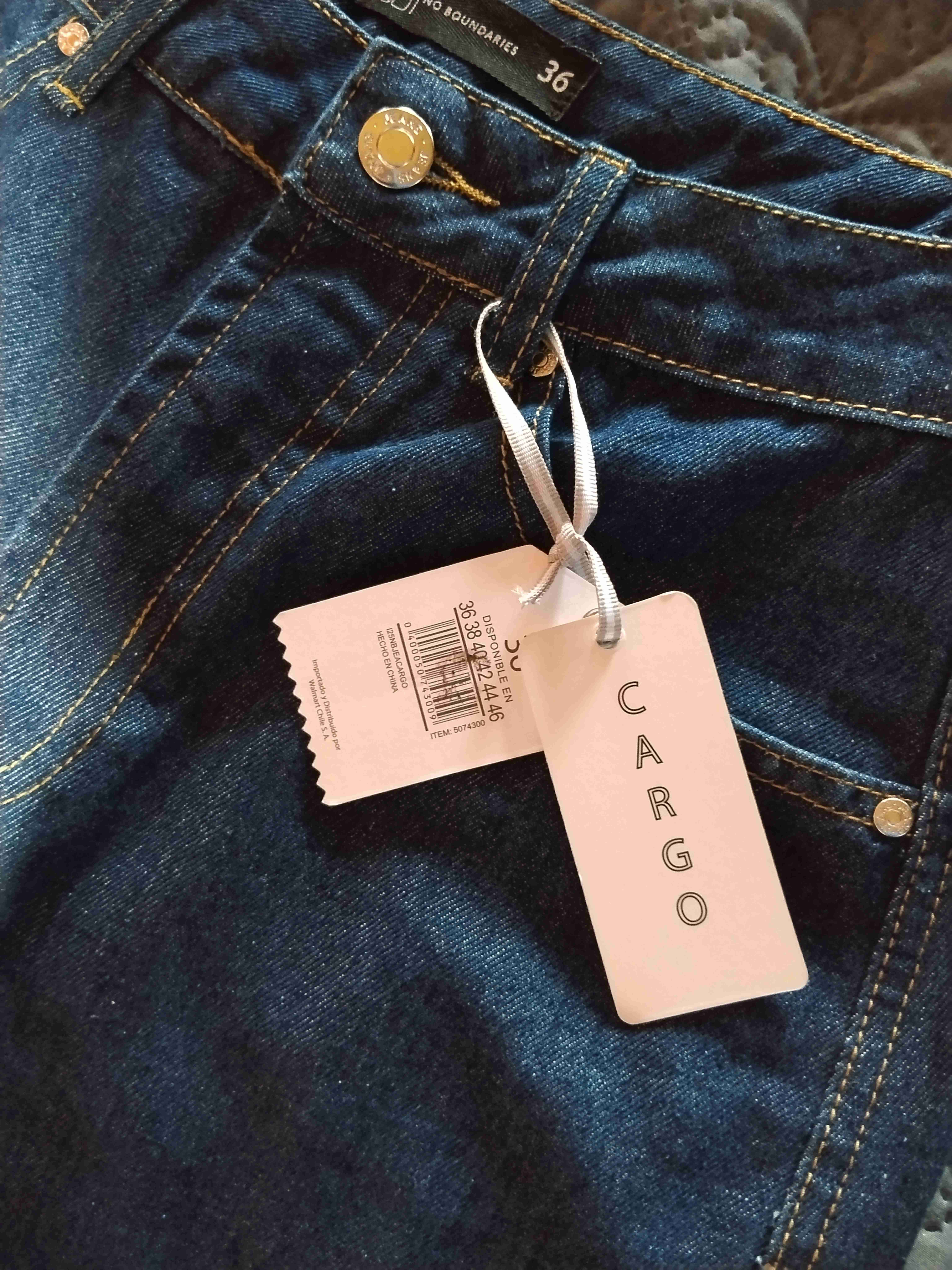 Jeans cargo color azul, perfectos para un look casual. Etiqueta visible indicando nuevo.