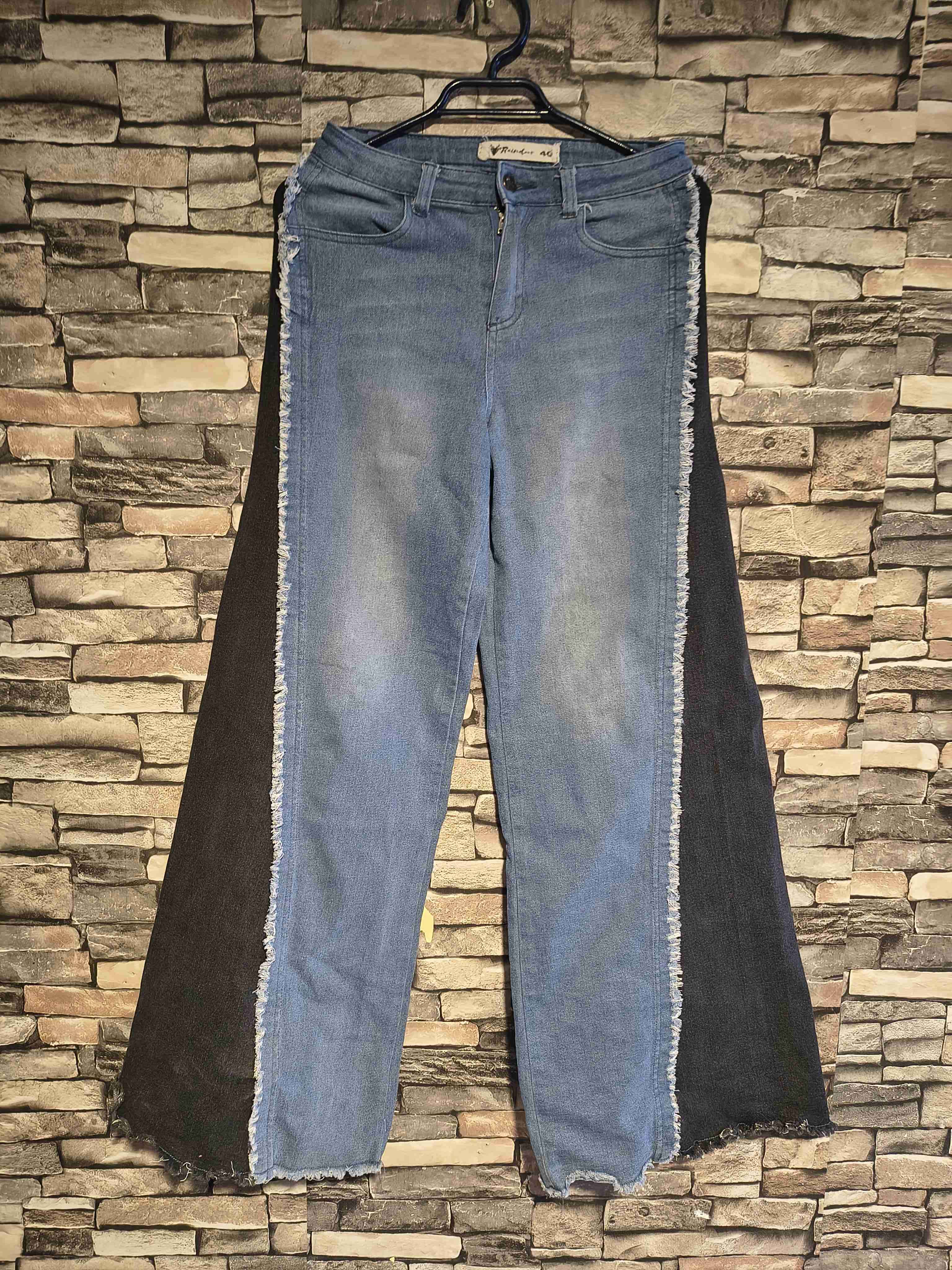 Jeans de diseño único bicolor, ideal para looks casuales. Estado general bueno, con detalles desflecados en los bordes.