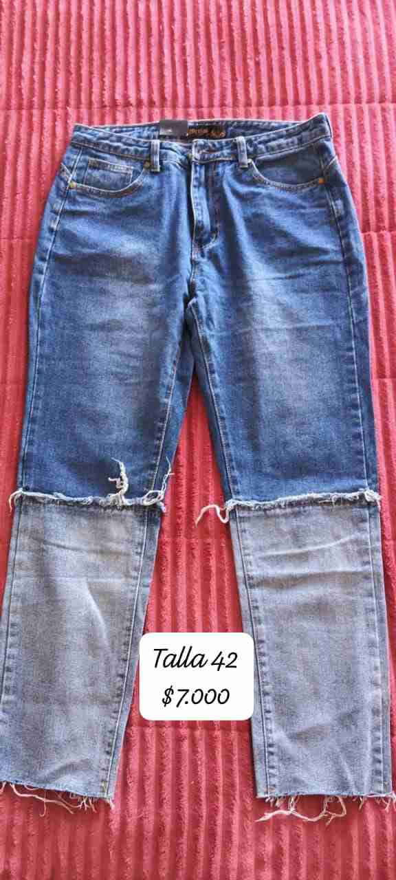 Jeans de mezclilla con detalle desgastado en las piernas. Estilo casual ideal para el día a día. Parka ,falda , poleron, chaqueta nuevos y usados.