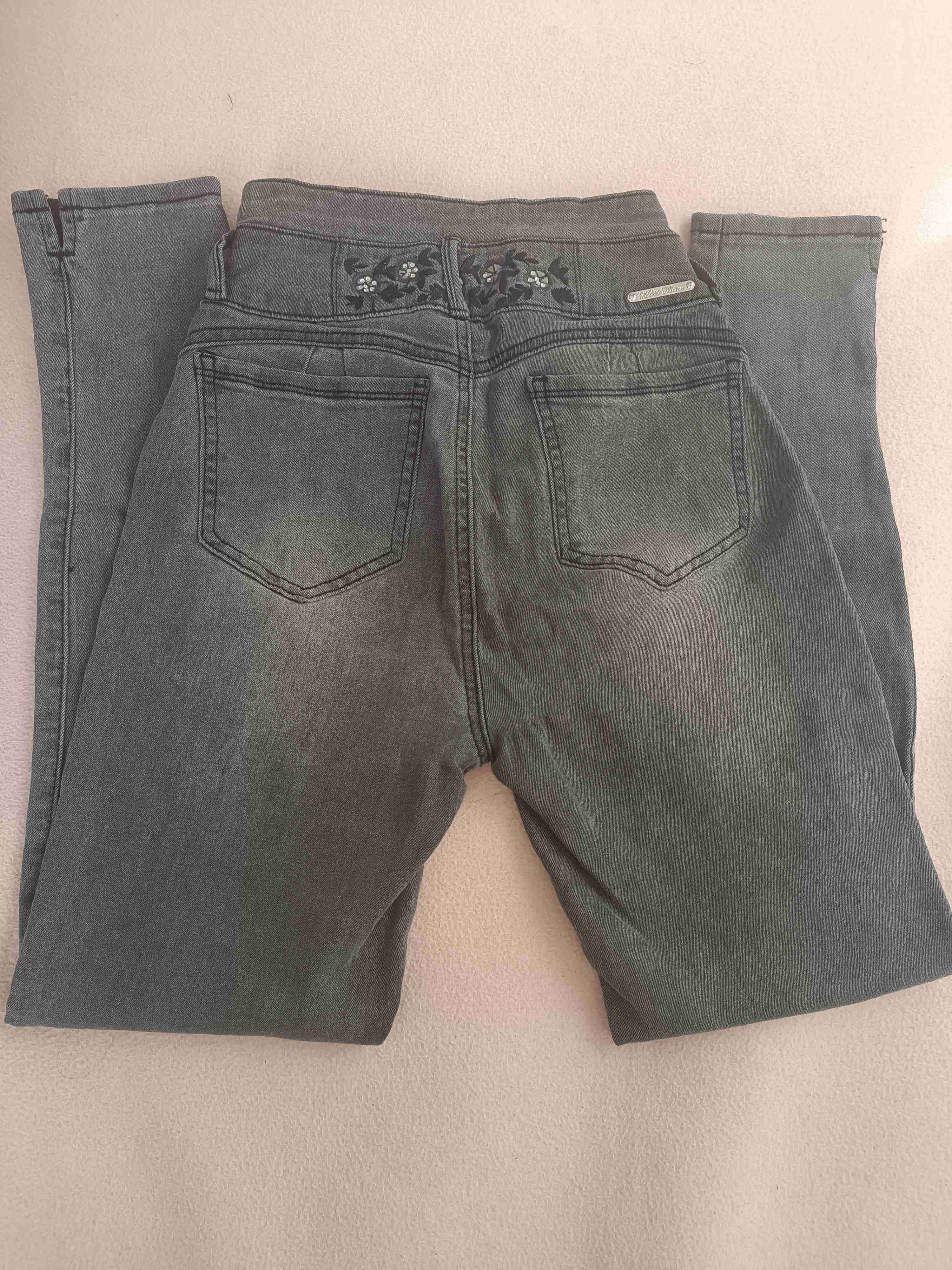 Jeans de mujer color gris con detalles de bordado floral en la cintura. En buen estado, perfectos para uso casual. Tienen un ajuste cómodo y moderno.
