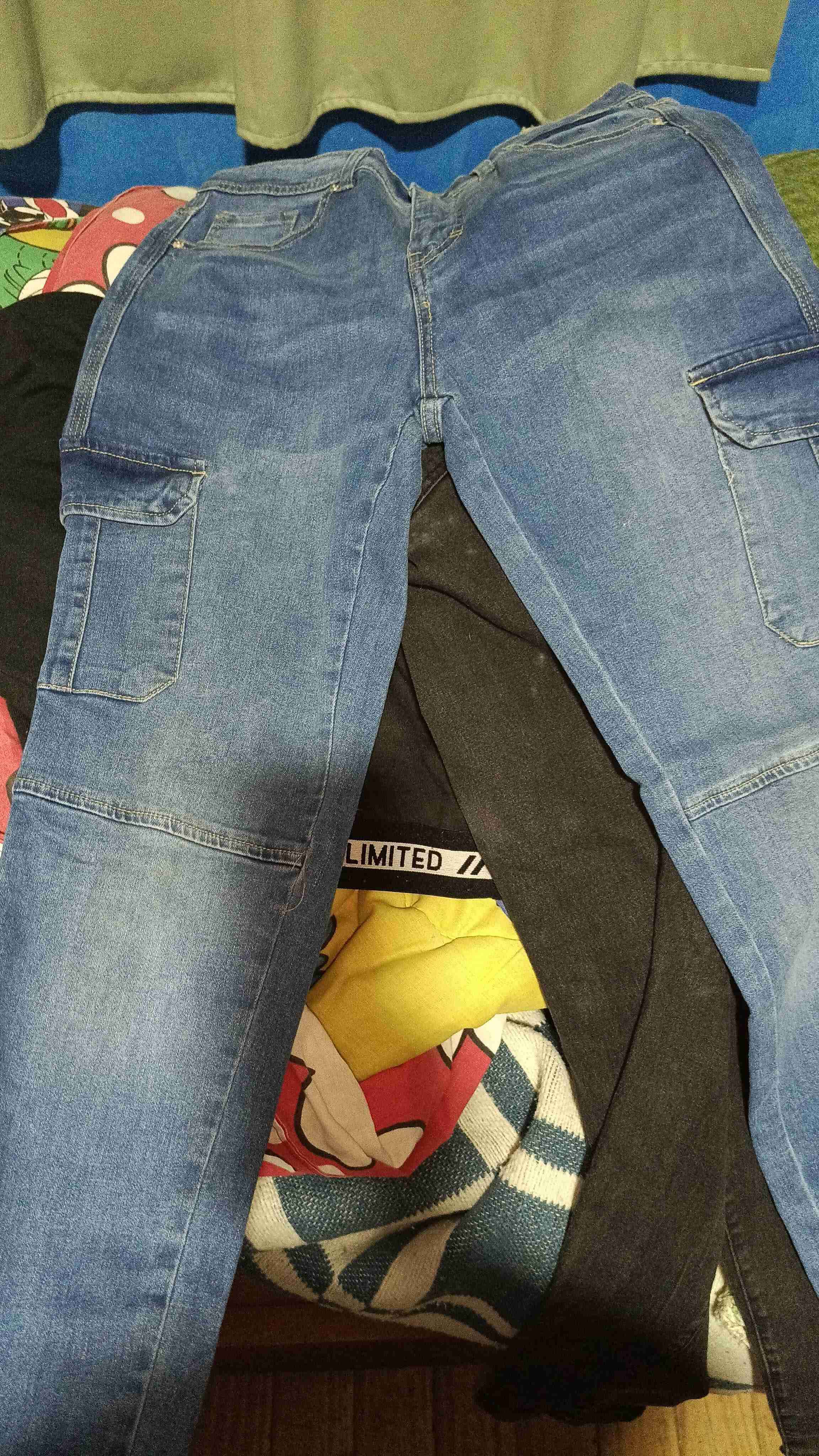 Jeans azul, estilo cargo con bolsillos amplios. En buen estado general perfecto para salidas informales. Talla 34