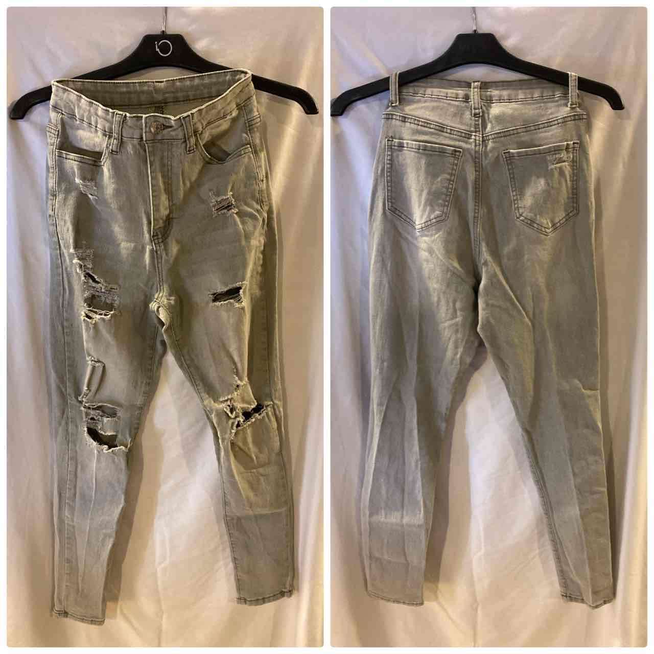 Jeans estilo desgastado con roturas, perfecto para un look casual. En buen estado con signos de desgaste en entrepiernas.