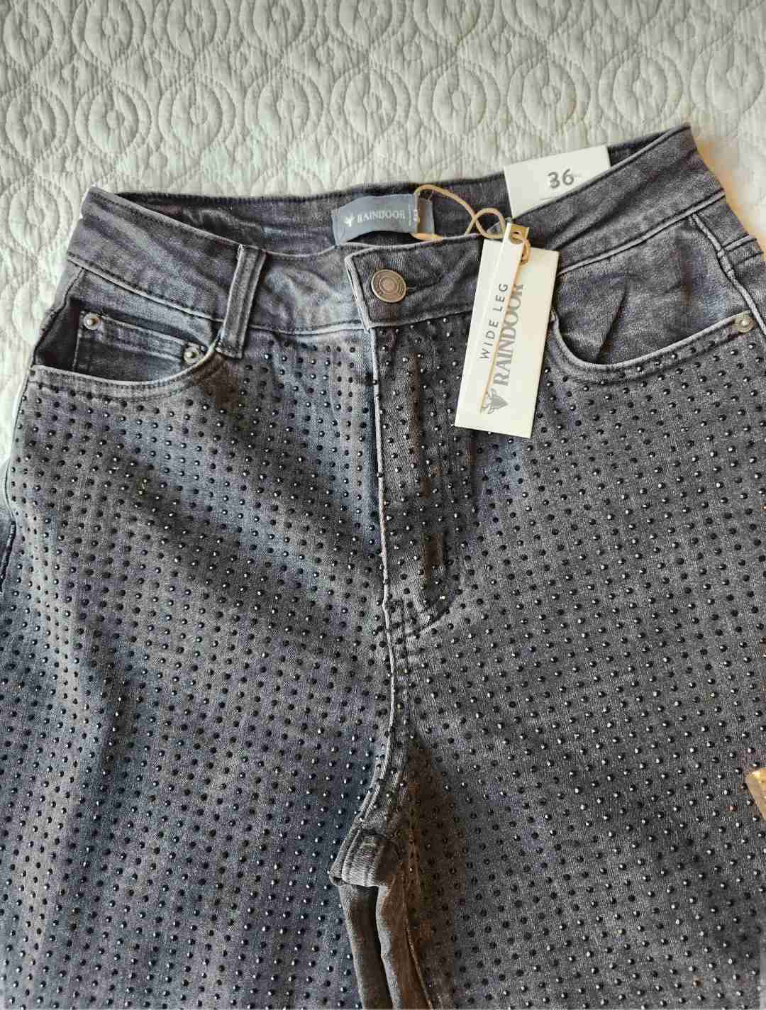 Pantalones de mezclilla anchos con detalles brillantes, perfectos para un look casual y moderno. Sin uso, con etiqueta.