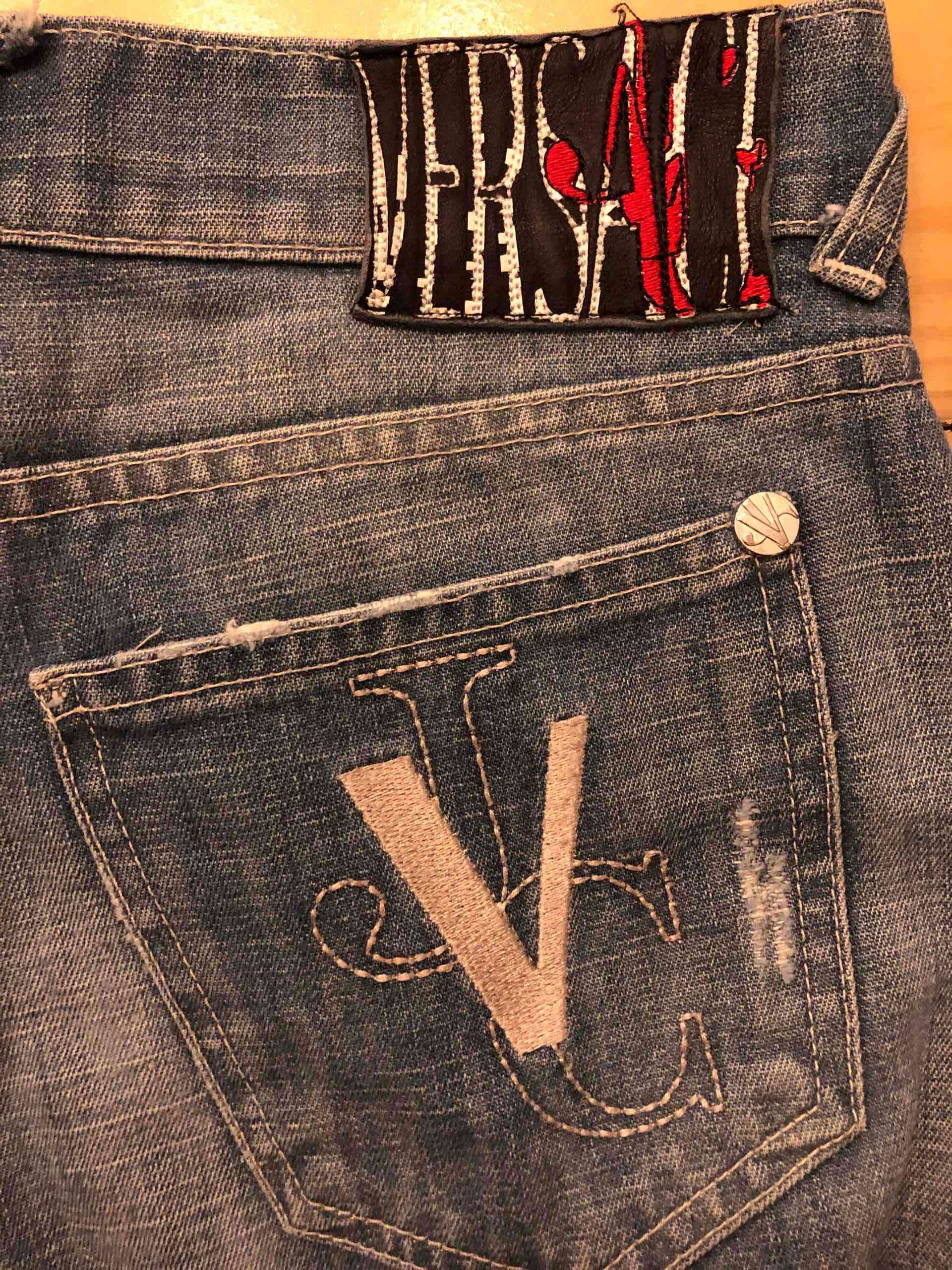Jeans Versace de mezclilla azul con logo bordado en el bolsillo trasero. En buenas condiciones, ideal para lucir casual.