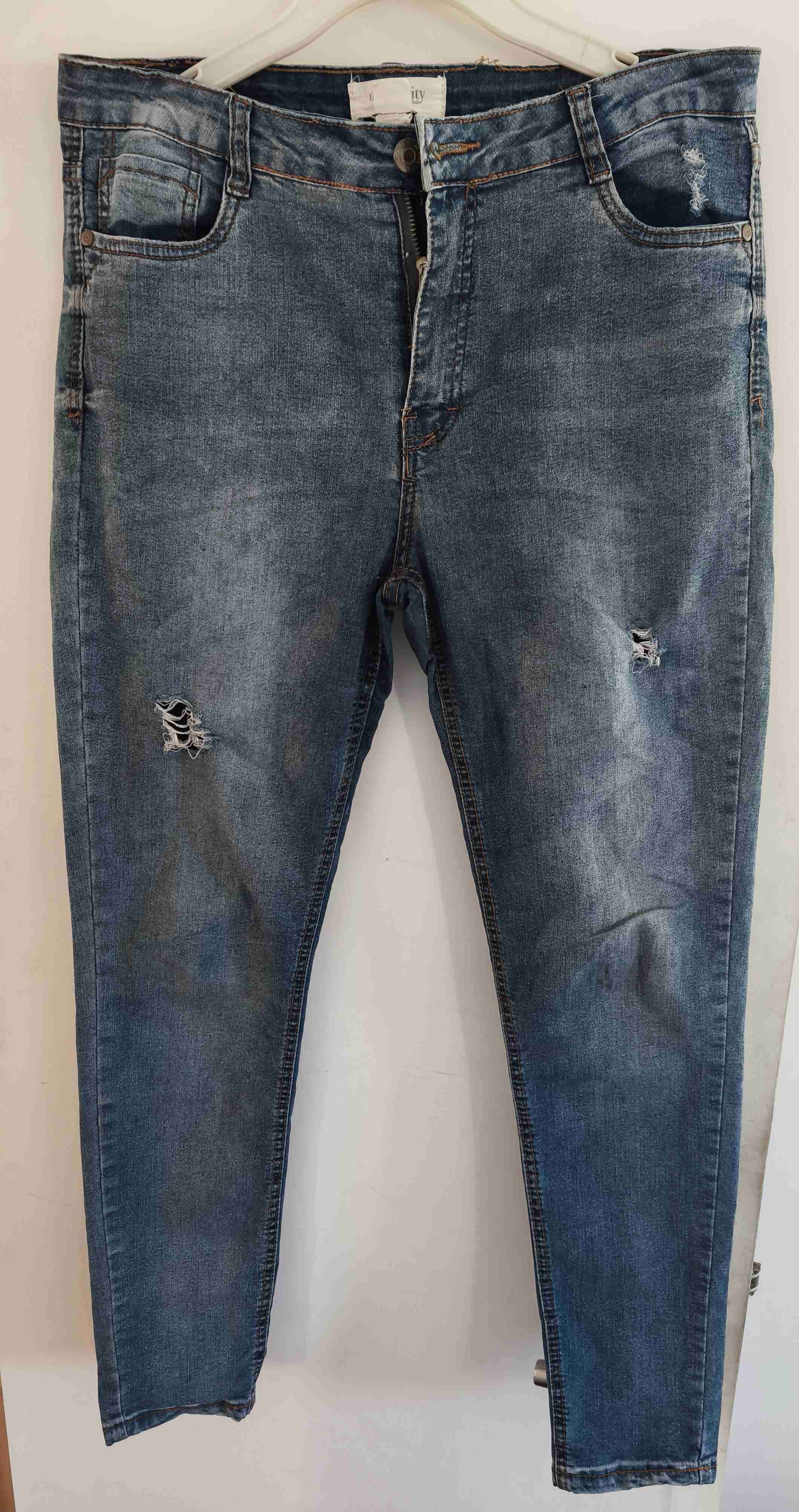 Jeans casual azul con diseño roto. Ideal para un look relajado y moderno. En buen estado con leves signos de uso.