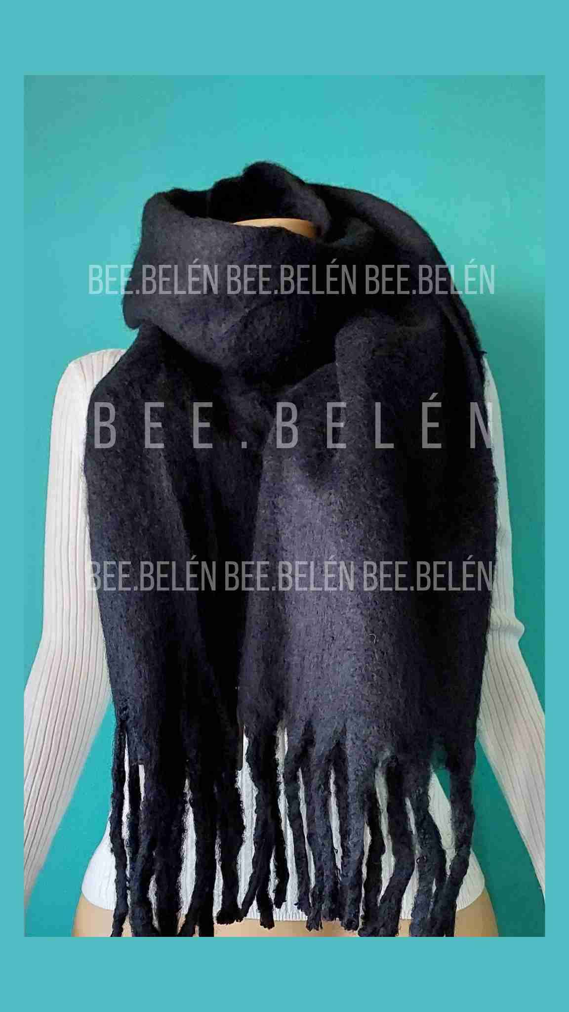 Elegante bufanda negra con diseño de flecos. Ideal para el invierno, nuevo.