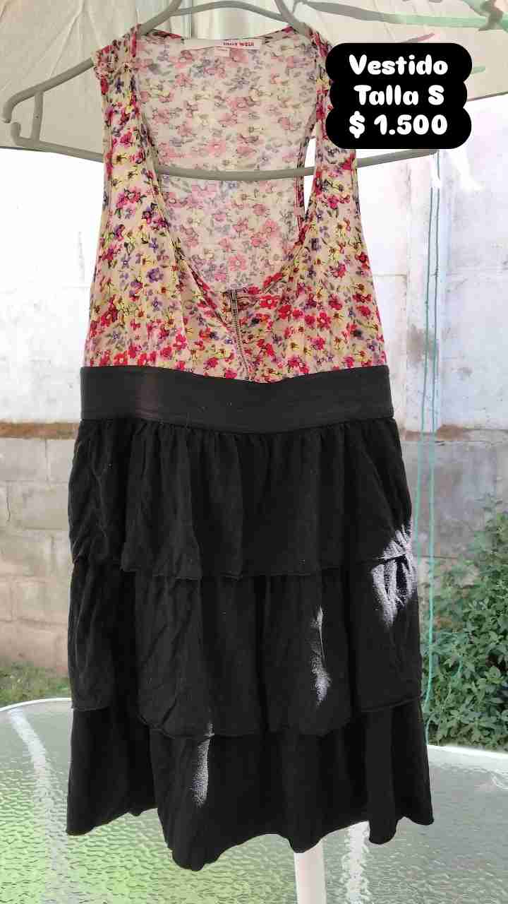Vestido con estampado floral y falda en capas negras. Perfecto para el verano, en buen estado general.