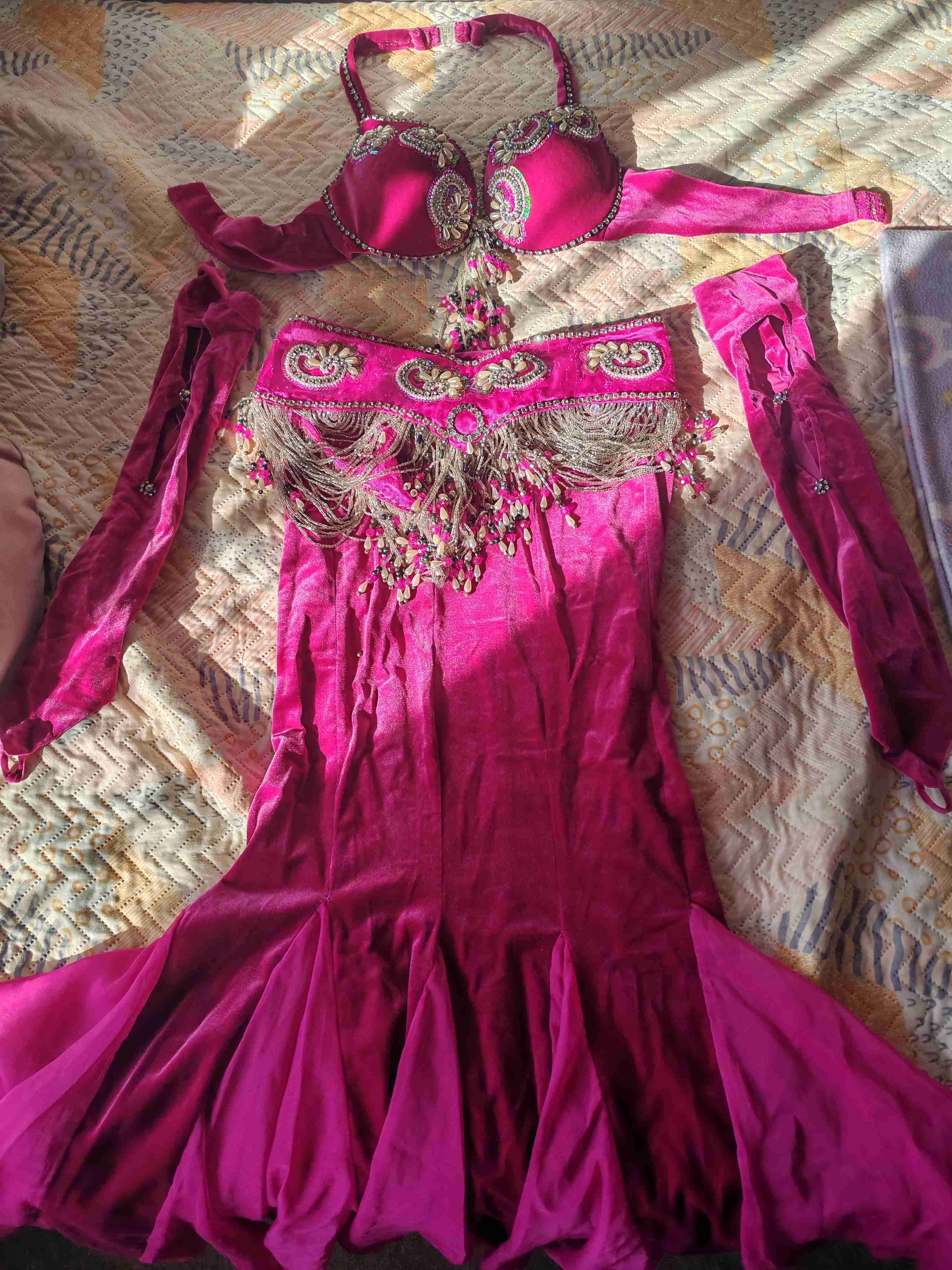 Conjunto de danza oriental en color rosado, adornado con lentejuelas y detalles brillantes. Falda tipo sirena y fajin talla 36. Sostén 34B. Incluye mangas.