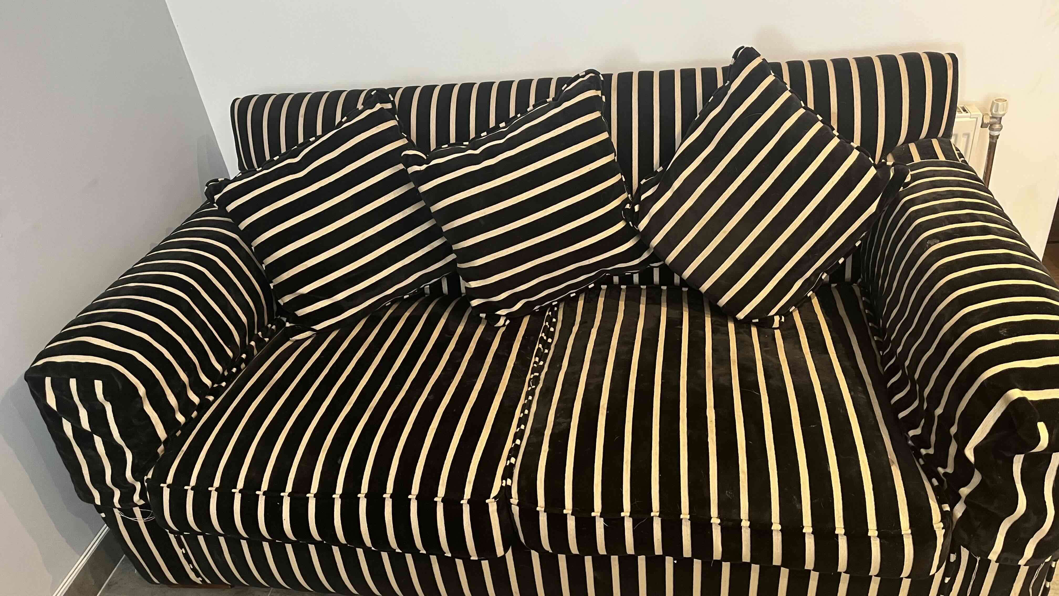 Sofá amplio con diseño de rayas blancas y negras. En buen estado general, ideal para sala de estar. Se ve cómodo y con cojines incluidos. De 2 cuerpos