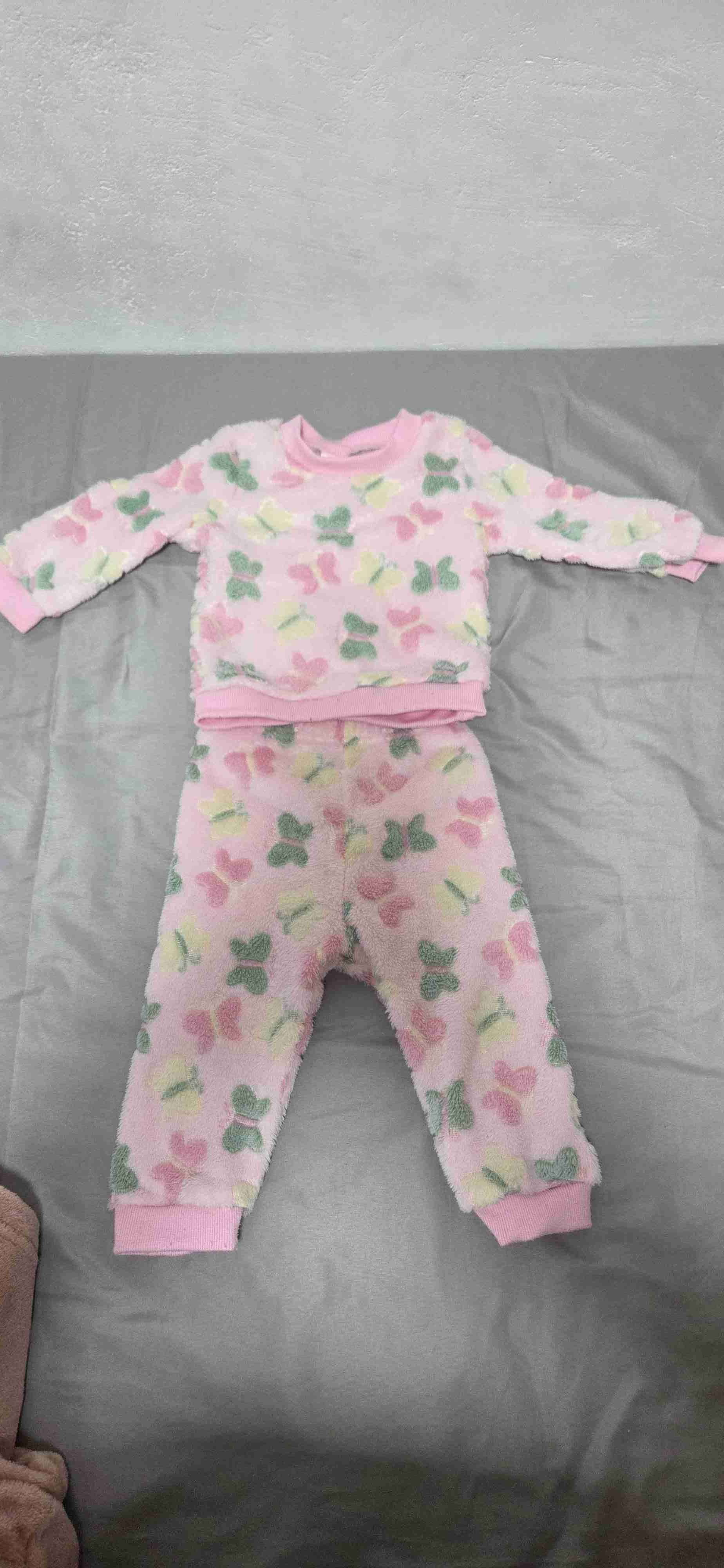 Pijama de dos piezas en tela polar, color rosado con diseño de mariposas. Ideal para abrigar a tu hija en noches frías.