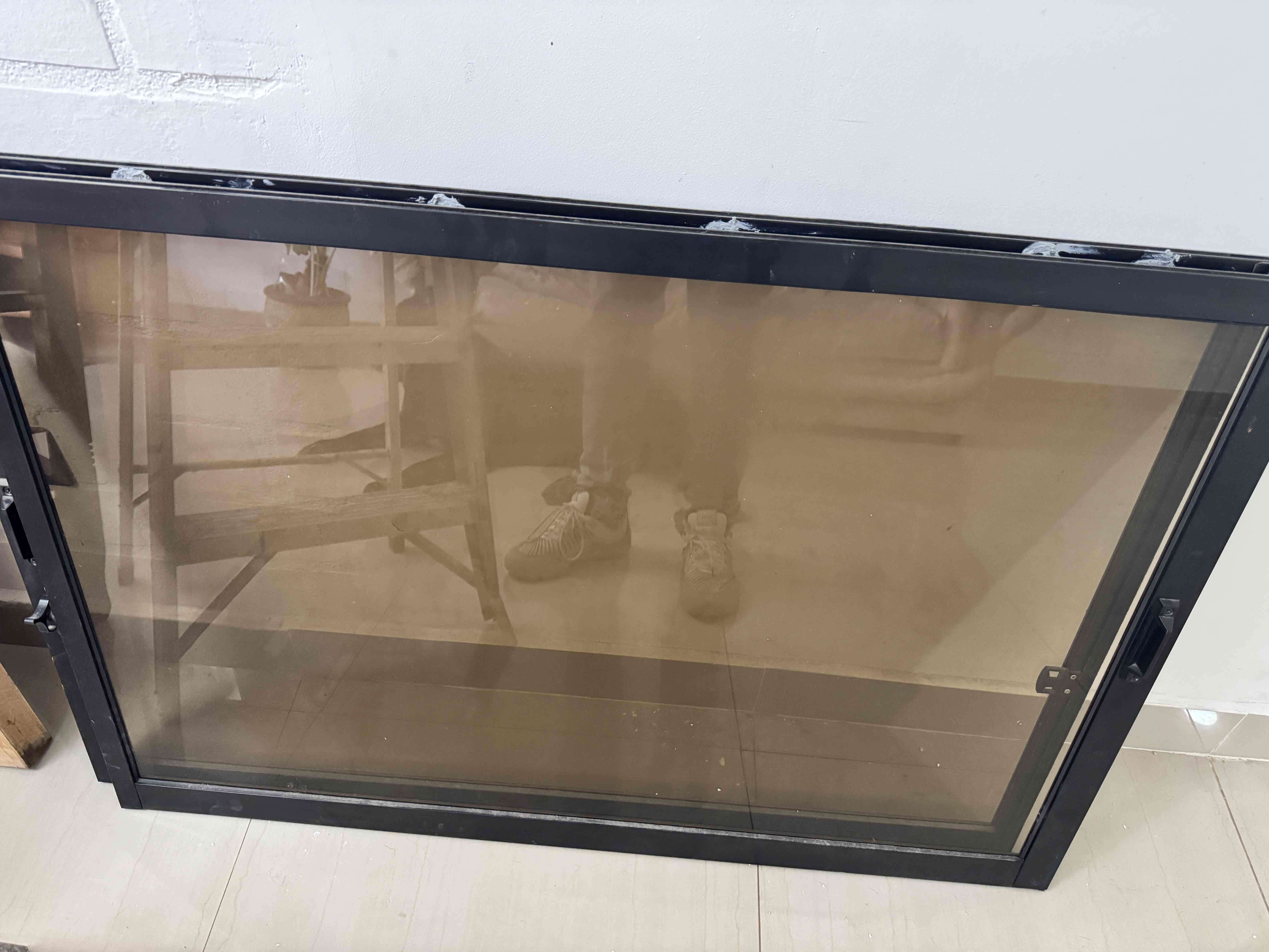 Panel de vidrio con marco negro, ideal para proyectos de construcción o renovación. En buen estado general con signos de uso.
