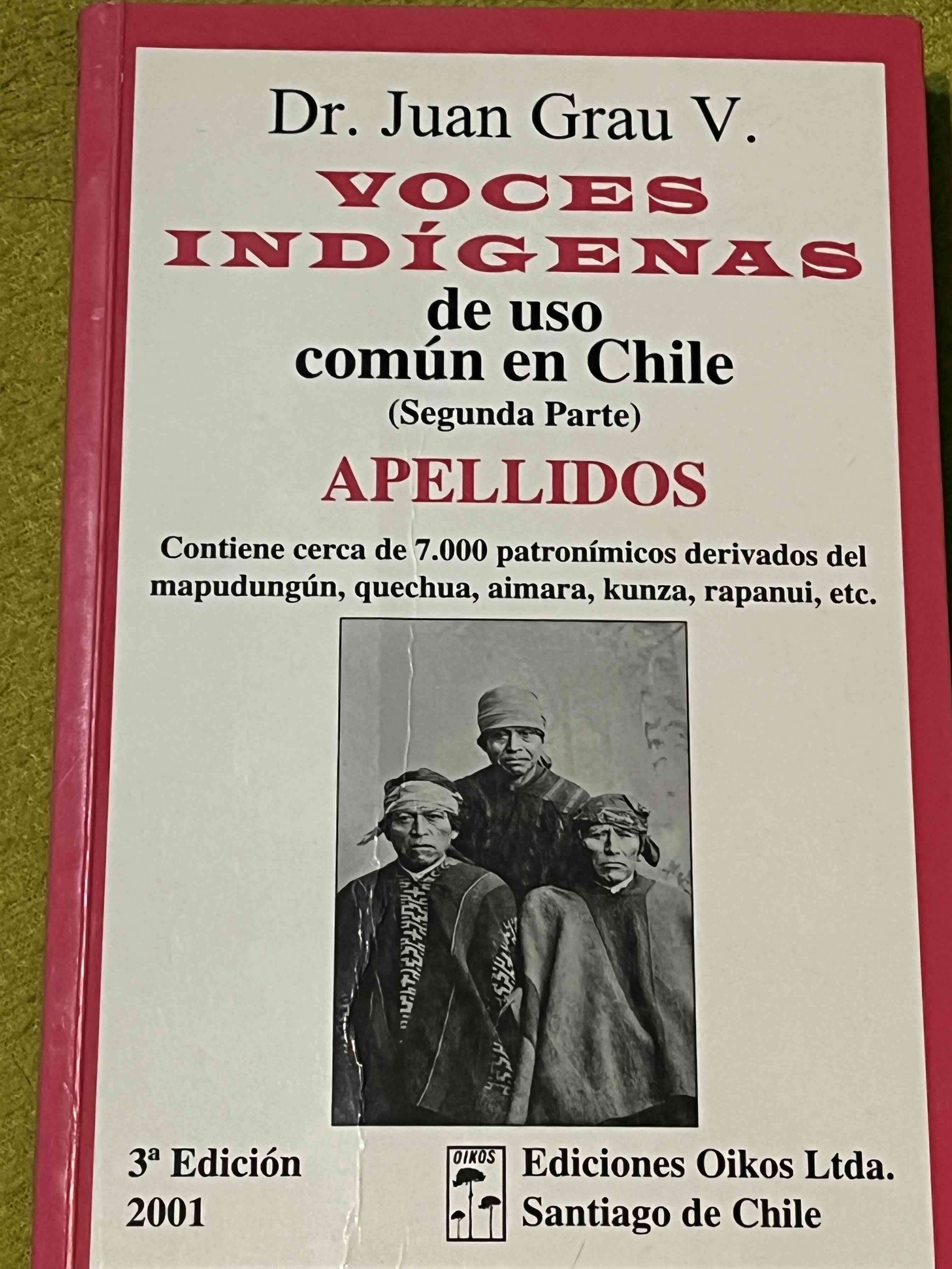 Libro de referencia sobre apellidos indígenas en Chile. Incluye cerca de 7.000 patronímicos. En buen estado.