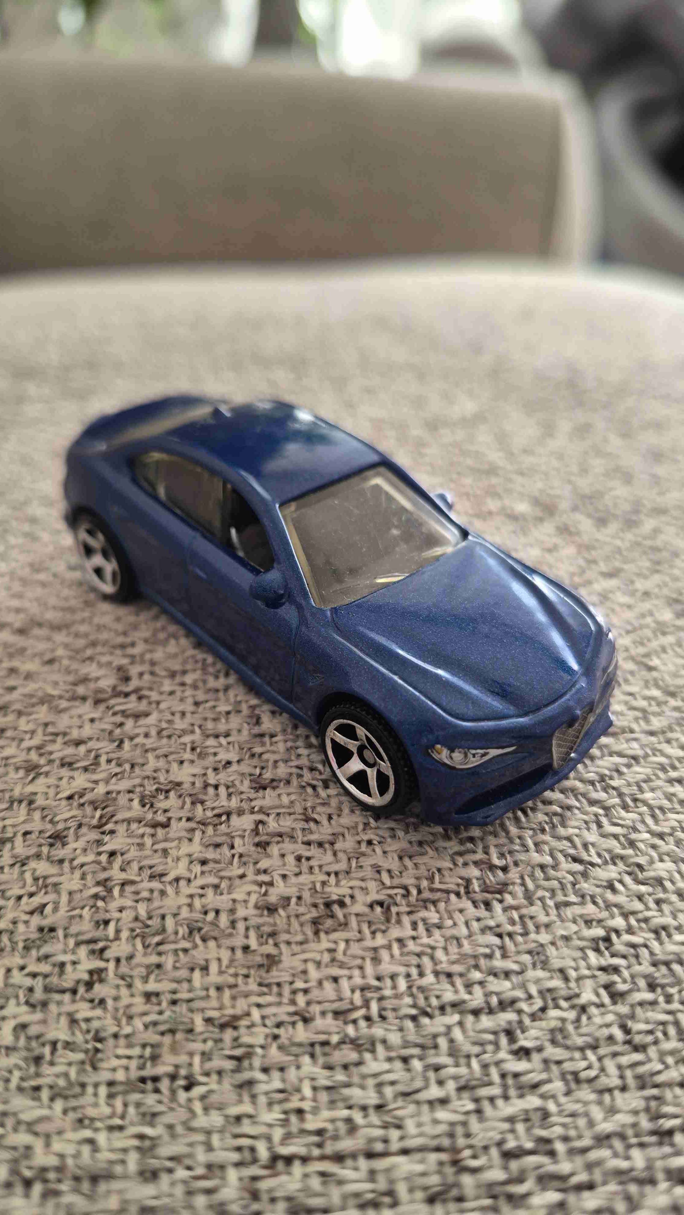 Modelo de auto de juguete en azul metálico, ideal para coleccionistas. En buen estado, detalles bien cuidados.
